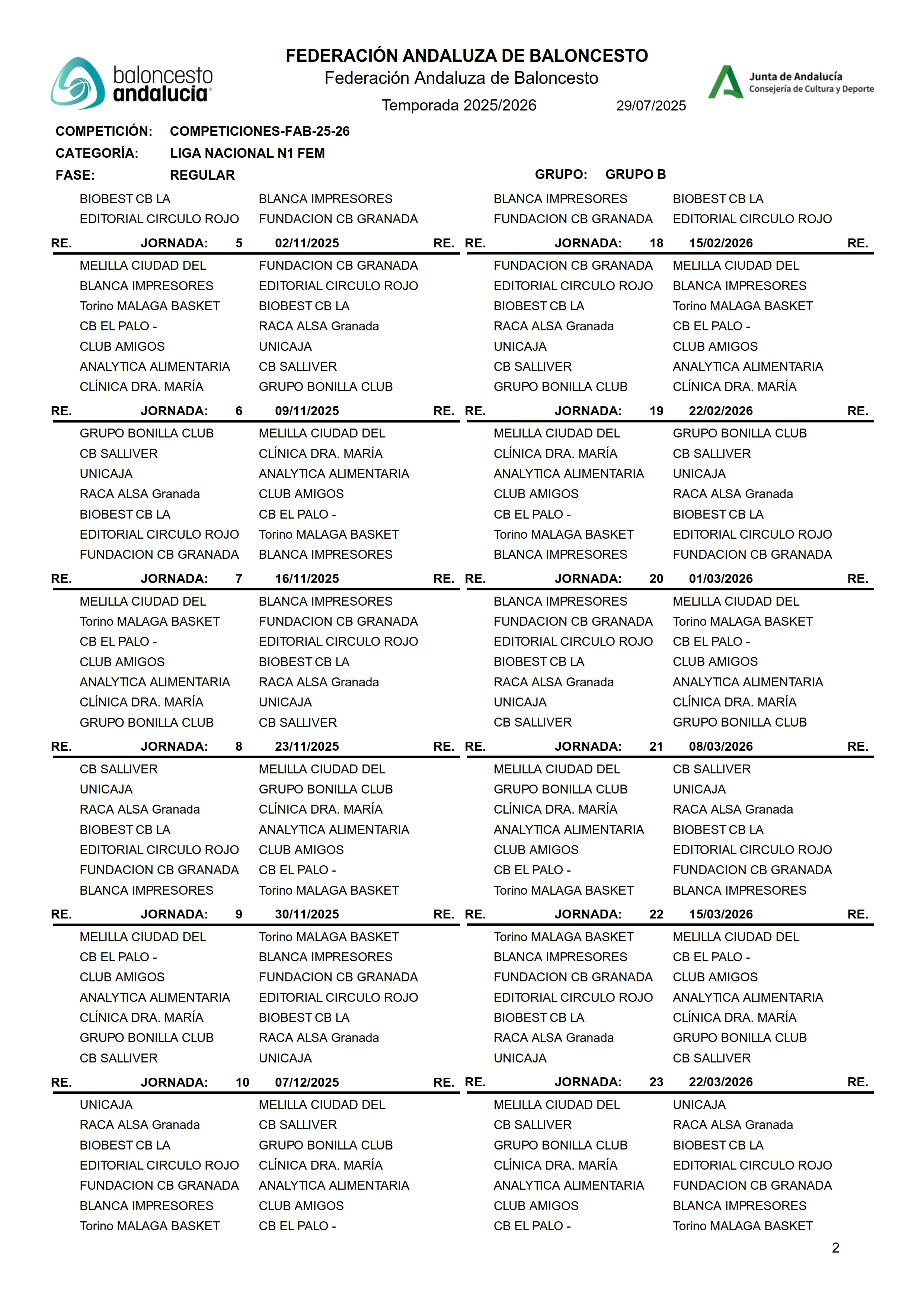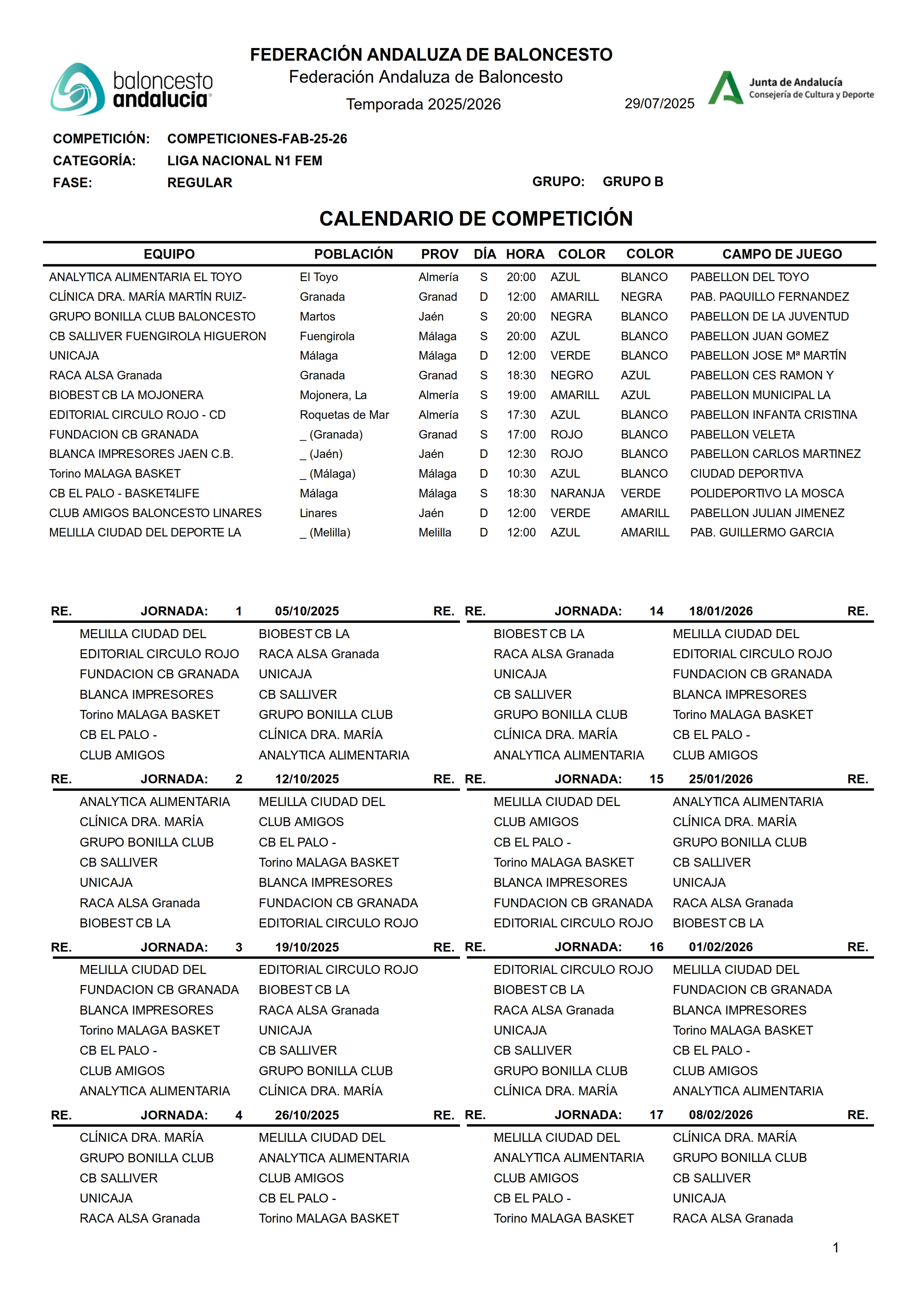 La Federación Andaluza de Baloncesto ha hecho público el calendario de competición de los grupos de Liga Nacional 1 Femenina para la presente temporada.