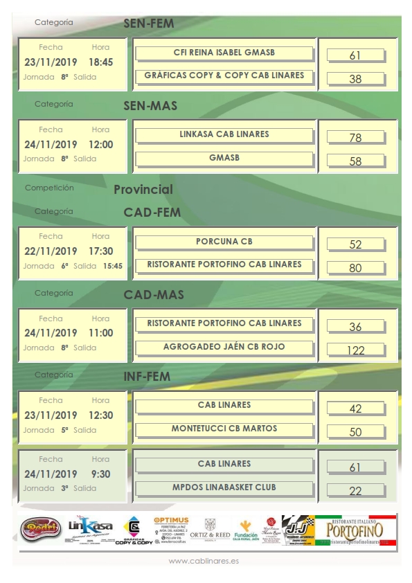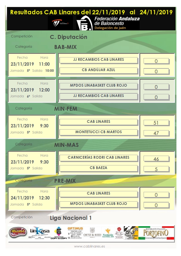 El domingo abría jornada el infantil femenino que recuperaba el partido aplazado en su día con CD Linabasket, partido en el que las chicas de Miguel A. y Nazaret se resarcían de la derrota del sábado logrando una victoria cómoda. A continuación el cadete masculino Ristorante Portofino CAB Linares cumplía el trámite de disputar su partido ante un equipo muy superior como es Jaén CB con el que caía derrotado ampliamente. En el Julián el equipo masculino de Liga Nacional 1 lograba la victoria en su partido de la jornada ante los granadinos de GMASB como hemos informado en otra entrada de la web anteriormente. Cerraba la jornada el premini mixto en el Huarte ante CD Linabasket.