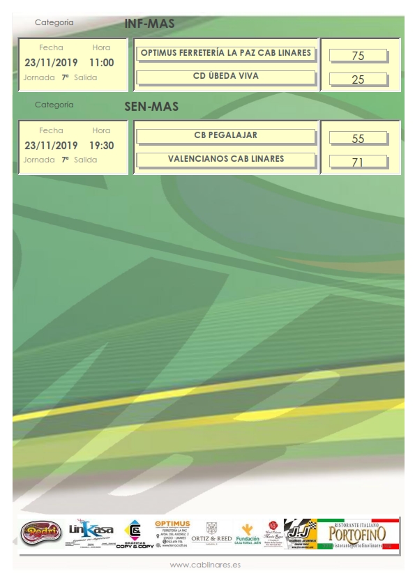 En la jornada de tarde el equipo femenino de Liga Nacional 1 Gráficas Copy & Copy CAB Linares volvía con derrota de su desplazamiento a Granada como hemos informado en este artículo y el senior masculino provincial Valencianos CAB Linares lograba una importante victoria en Pegalajar para seguir manteniendo opciones de entrar en la segunda fase de la competición.