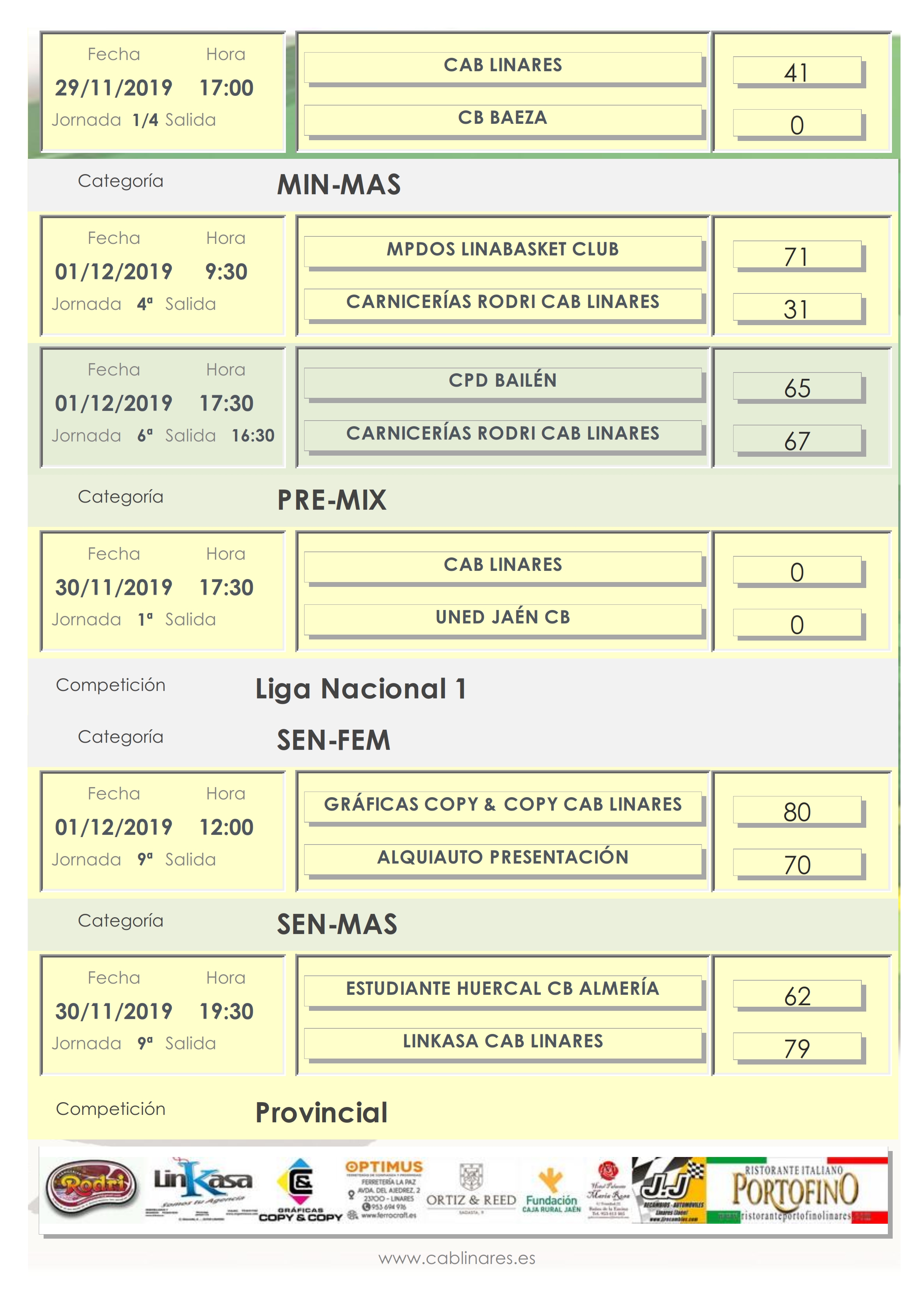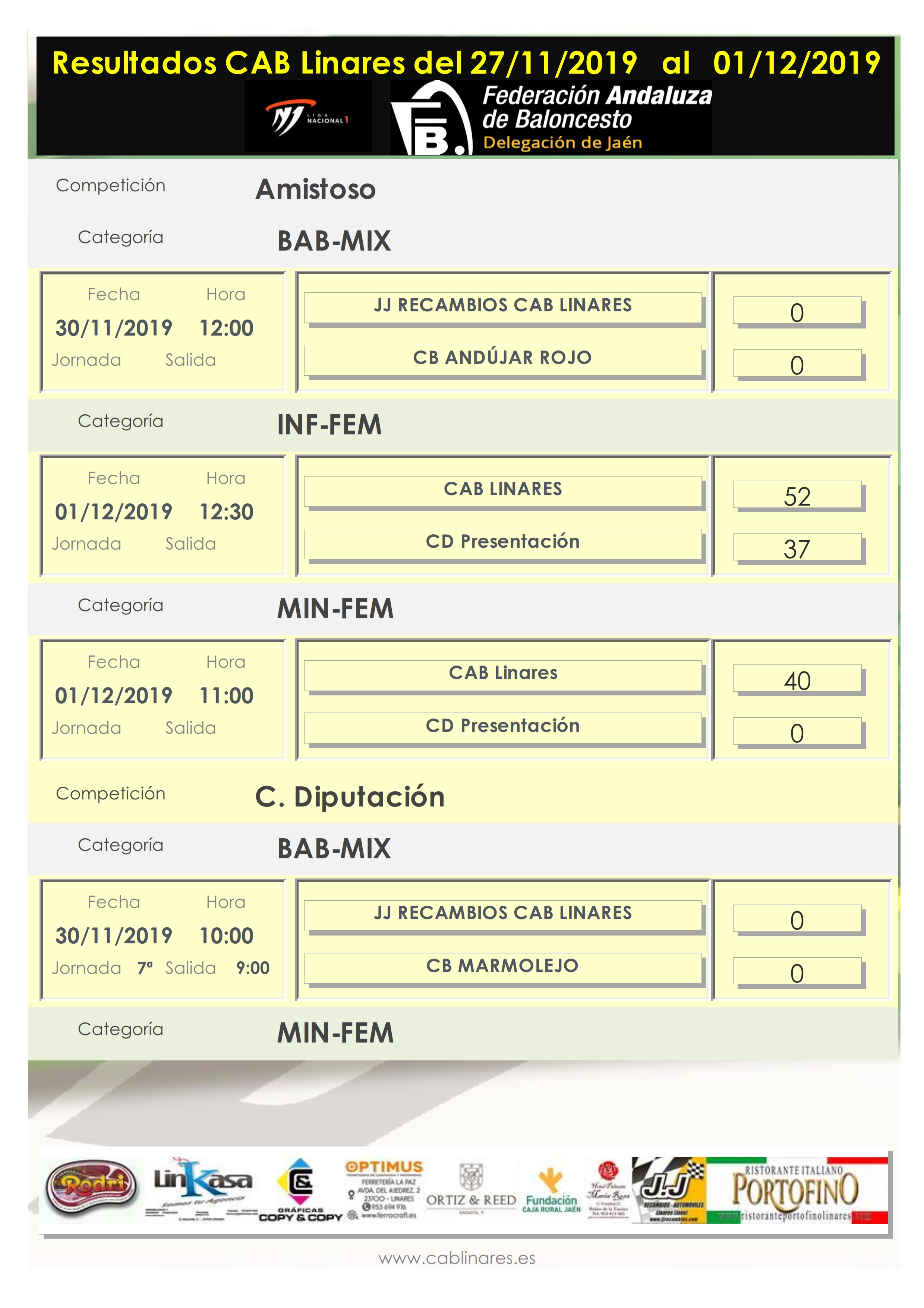 El miércoles por la tarde iniciaba la jornada el cadete masculino Ristorante Portofino CAB Linares que viajaba a Úbeda donde resolvía sin problemas su encuentro de liga regular. El viernes por la tarde el mini femenino vencía en el partido de cuartos de final de la Copa Diputación a CB Baeza y el infantil masculino Optimus Ferretería La Paz CAB Linares no abandonaba la senda del triunfo en su enfrentamiento con el equipo B de CB Andújar, que le hace mantenerse invicto hasta este momento de la competición provincial.