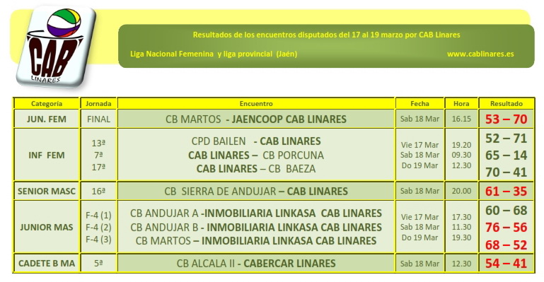 Comenzaba el viernes por la tarde la disputa de la Fase Final Junior Masculino en Martos, en la que nuestro equipo, Inmobiliaria Linkasa CAB Linares buscaba el campeonato provincial y la clasificación para el Campeonato de Andalucía. En esta primera jornada se enfrentaba con el equipo A de CB Andújar, en el que tras un partido muy igualado, vencía por ocho tantos de diferencia. En el otro encuentro, tras una prórroga, el anfitrión, CB Martos, se imponía al equipo B iliturgitano.