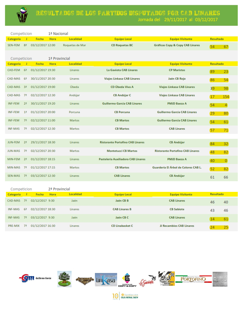 El sábado por la mañana abría jornada el cadete masculino B, que caía derrotado en su visita a Jaén CB. El infantil femenino Guillermo García CAB Linares y el infantil masculino A vencían en sus enfrentamientos ante CB Martos en la ciudad de la Peña. Lo mismo hacía el junior masculino A Ristorante Portofino CAB Linares, que en una gélida noche se imponía en el Pabellón de la Juventud a los marteños. El cadete masculino A Viajes Linkasa CAB Linares derrotaba el equipo C de CB Andújar a domicilio y el infantil masculino B caía derrotado en el Huarte ante CB Sabiote.