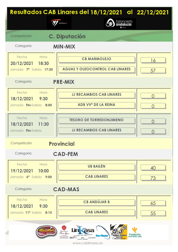 Última jornada de competición de este año 2021 que nos deja resultados dispares en las competiciones provinciales. El equipo de LN1 Femenina Linkasa CAB Linares descansaba por calendario esta jornada.