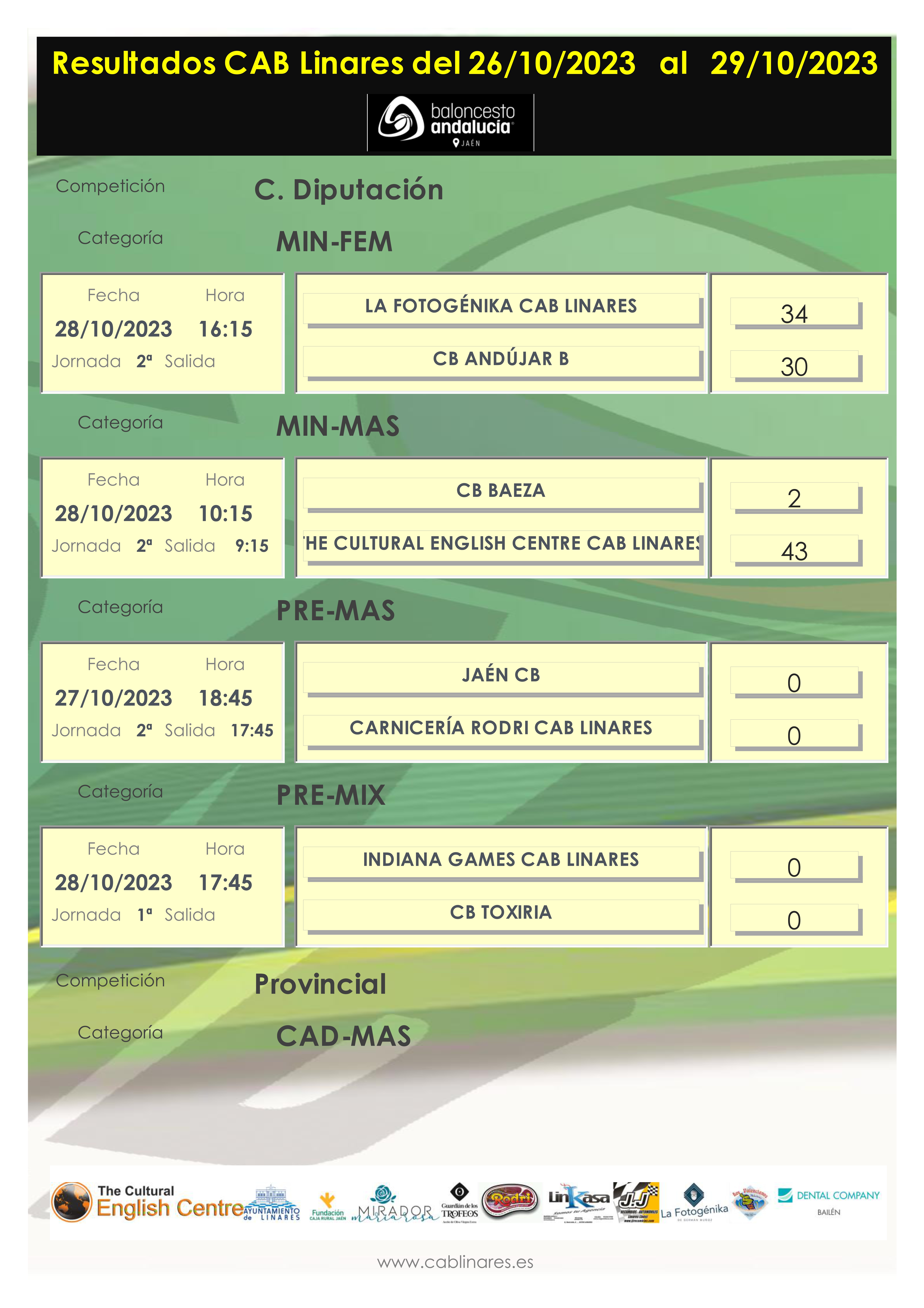 En la mañana del sábado el mini mixto, The Cultural English Centre CAB Linares, disputaba su partido de Copa Diputación en Baeza, alzándose con una cómoda victoria y el premini masculino Carnicería Rodri CAB Linares, viajaba a Jaén para jugar su encuentro de la jornada ante Jaén CB.