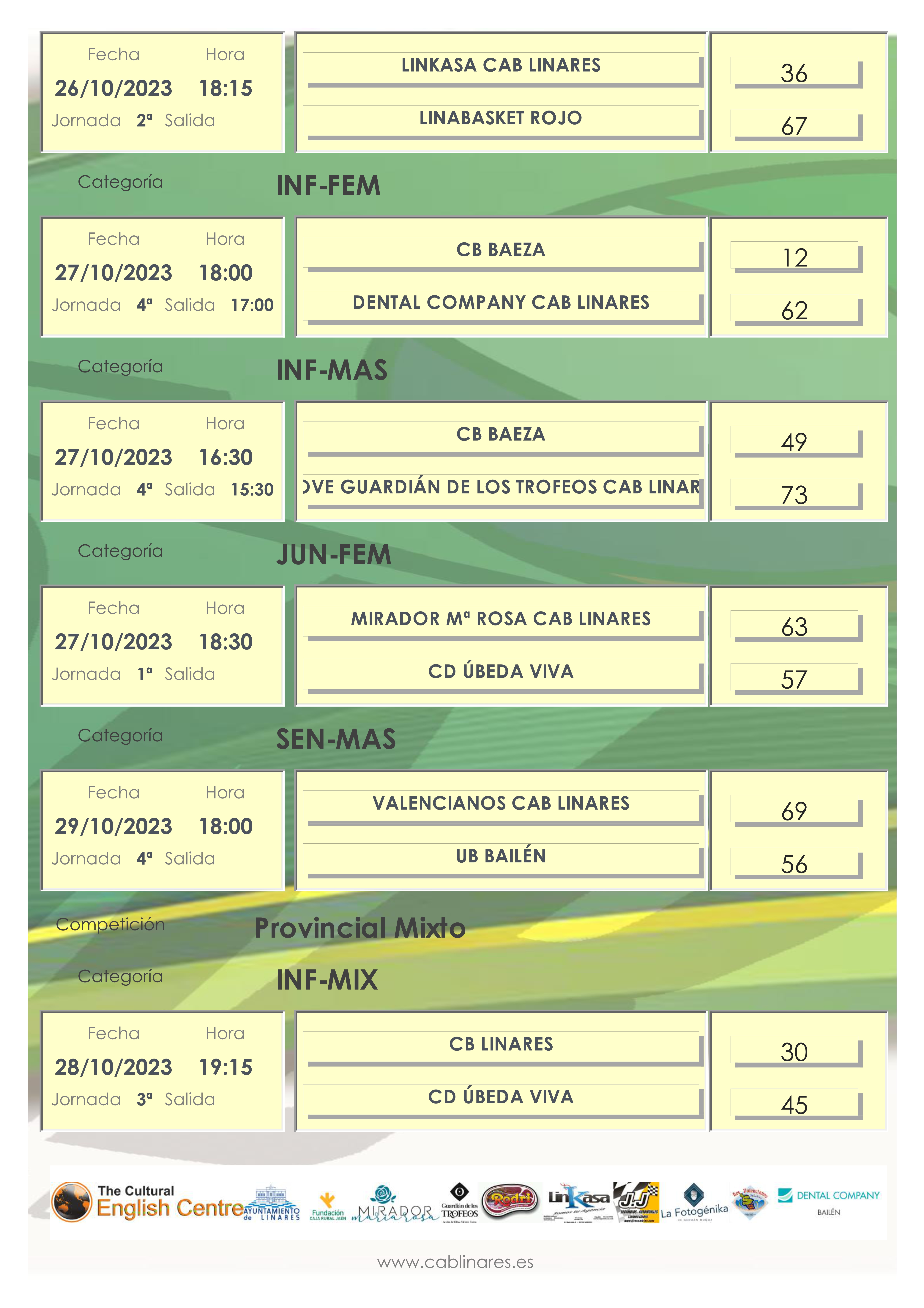 A primera hora de la tarde el mini femenino La Fotogénika CAB Linares lograba su primera victoria de la temporada ante el equipo B de CB Andújar. A continuación el premini mixto Indiana Games CAB Linares recibía la visita de CB Toxiria y cerraba la tarde en el Huarte el infantil mixto, CB Linares, que caía derrotado ante CD Úbeda Viva.
