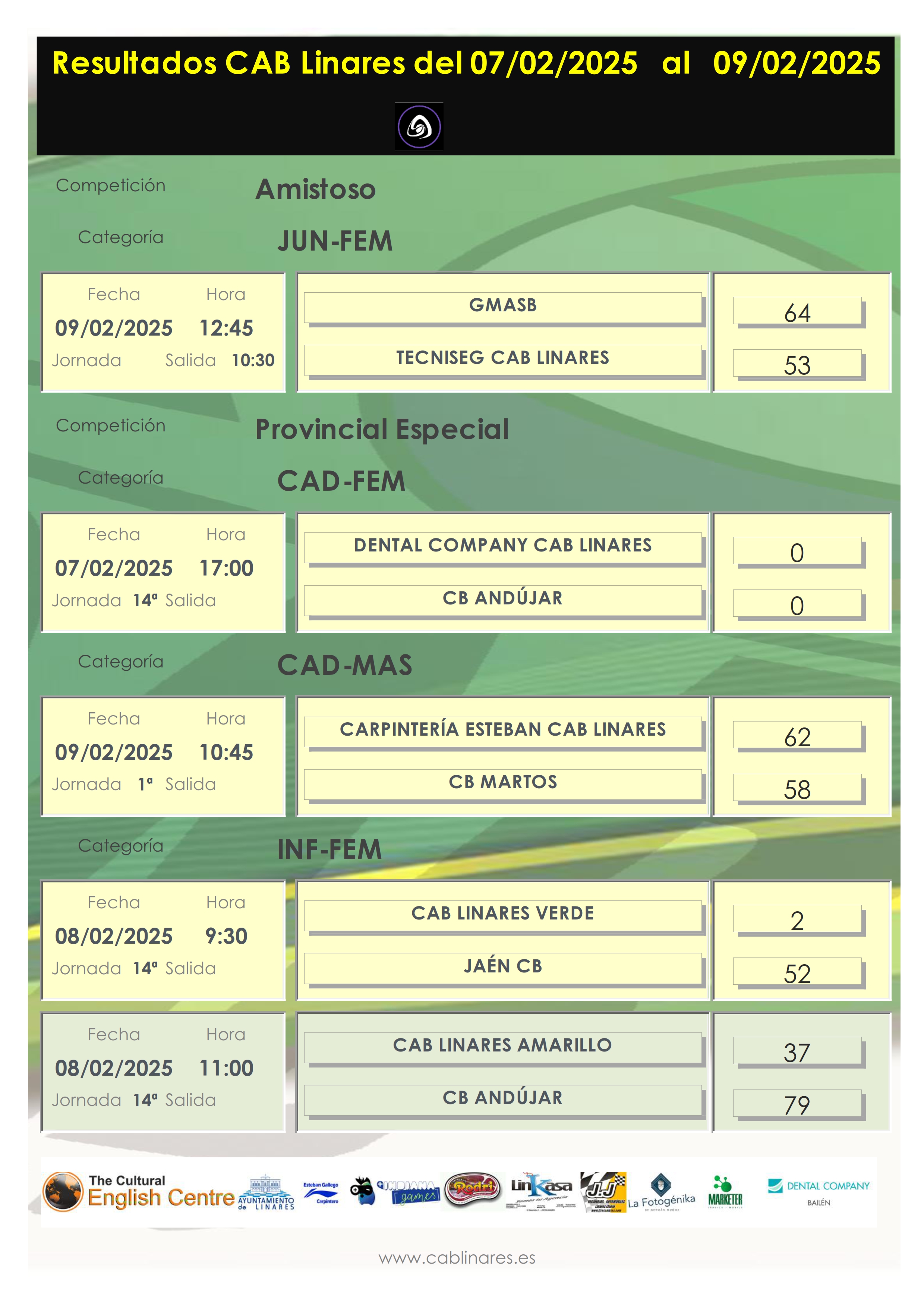 En el Huarte se aplazaba el partido cadete femenino que tenía que enfrentar a las chicas de Rosa, del Dental Company CAB Linares, con CB Andújar. El premini femenino, Indiana Games CAB Linares recibía a CB Andújar en la Liga Valorcesto. Ya en la tarde noche, el senior femenino recuperaba su encuentro aplazado con Jaén CB al que se imponía por un corto resultado en un partido que estuvo muy igualado.