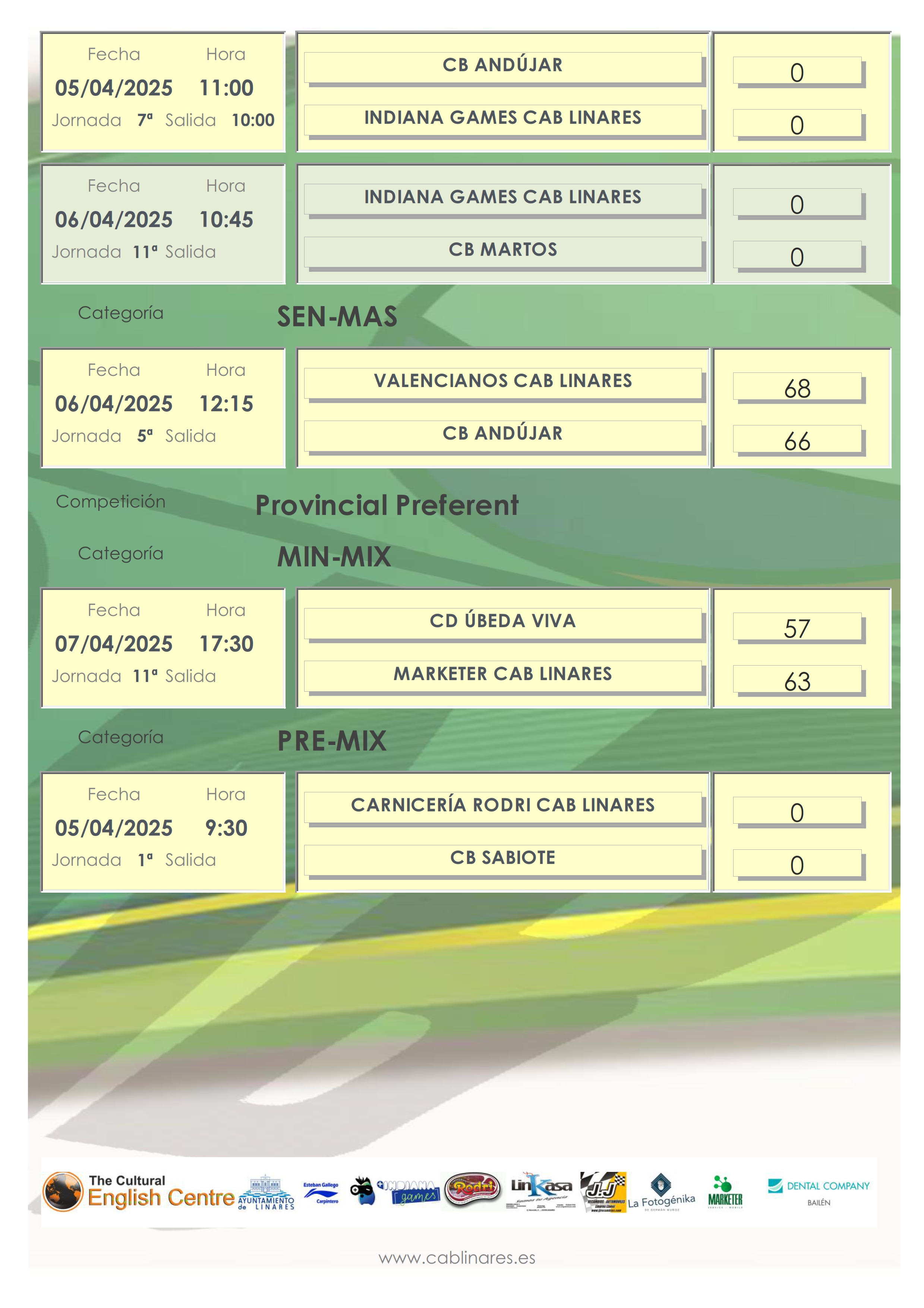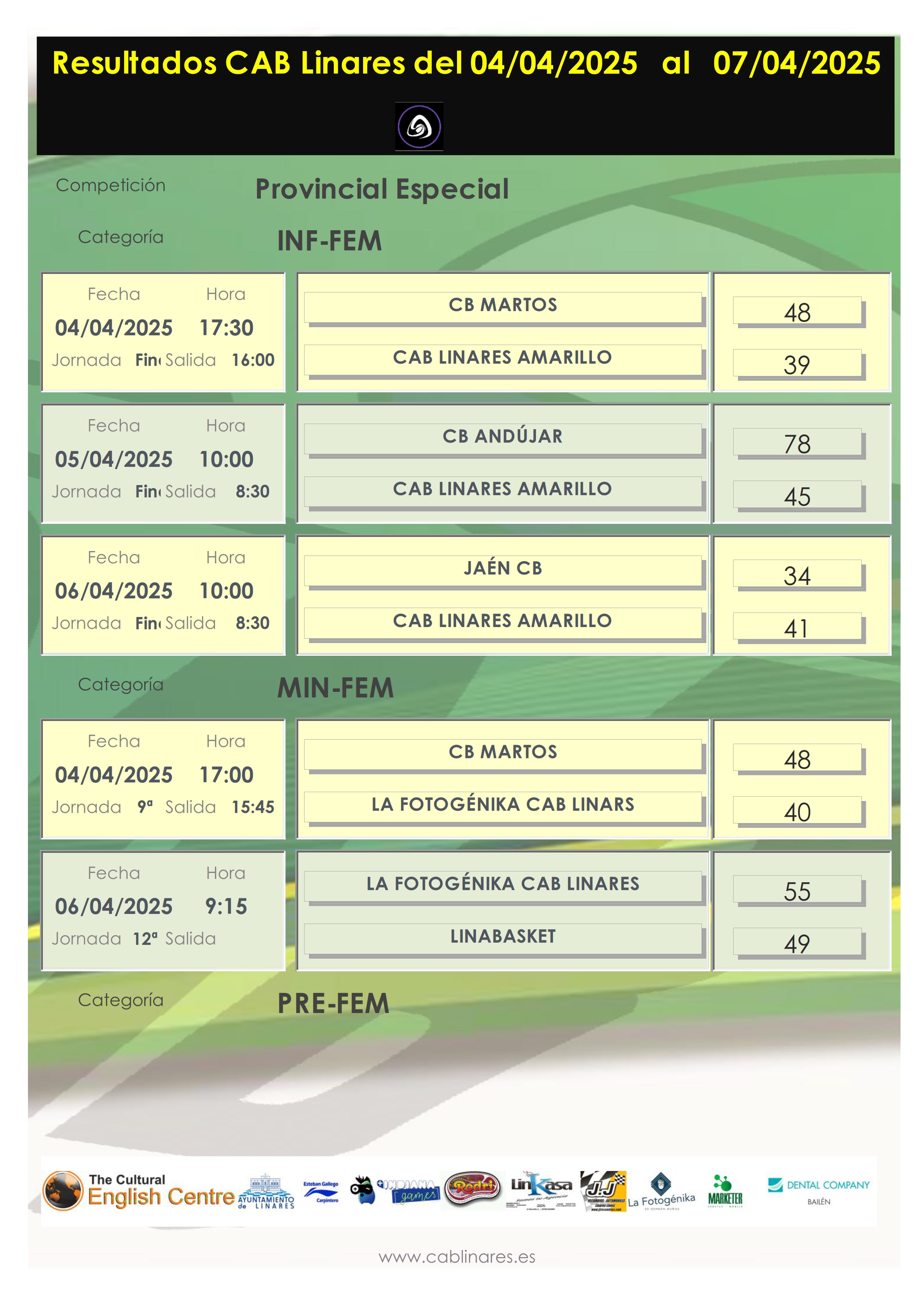 Ya en la mañana del domingo, el minii femenino, La Fotogénika CAB Linares, lograba la victoria en el derbi local ante CD Linabasket, en un partido muy igualado y que se decidió prácticamente en el cuarto período con un parcial muy favorable a las amarillas. El premini femenino, Indiana Games CAB Linares, recibía a CB Martos en su partido de la jornada de Liga Valorcesto. Cerraba el domingo el senior masculino, Valencianos CAB Linares, que en un partido igualado hasta los instantes finales, se imponía a CB Andújar.