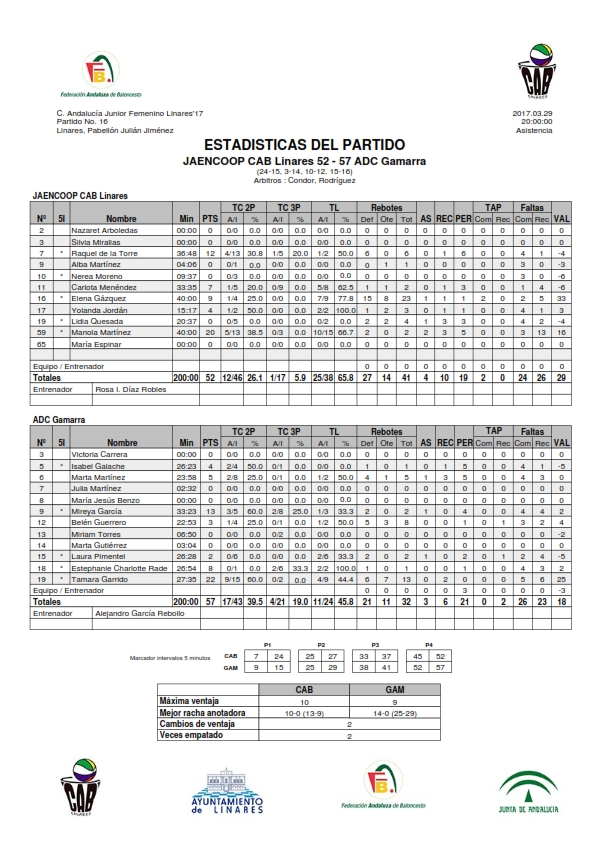 Entraron las chicas de Rosa y Eusebio nerviosas al encuentro, lo que permitió a las campeonas malagueñas del ADC Gamarra endosar un parcial de inicio de 0-7. Poco a poco las nuestra fueron entrando en el partido, y a base de una fuerte defensa y rápidas transiciones lograron devolverle a las rivales un parcial de 10-0 y lograr ventajas en el marcador que llegaron a los diez puntos.