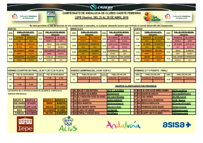 Las rivales de las nuestras en este campeonato en la primera fase serán Ramón y Cajal de Granada, subcampeón granadino, equipo contra el que debutarán esta tarde a las 15:00 h. Mañana miércoles el rival de turno será el subcampeón onubense Ciudad de Huelva a partir de las 18:00 h y para terminar la fase de grupos el jueves a las 15:30 h se enfrentarán a las campeonas sevillanas de Dos Hermanas. En caso de clasificación a partir del viernes se disputarán las eliminatorias por el título andaluz que ya logró nuestro club la pasada temporada también en tierras onubenses.