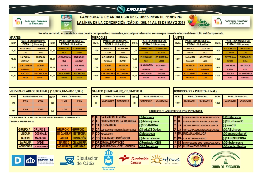 En la mañana de hoy ha sido sorteado el emparejamiento de grupos para el Campeonato de Andalucía Infantil Femenino 2019 que se disputará en la localidad gaditana de La Línea de la Concepción a partir del martes de la próxima semana y en la que participará nuestro equipo Pastelería Auxiliadora CAB Linares tras el subcampeonato provincial obtenido en la Fase Final disputada el pasado fin de semana.
