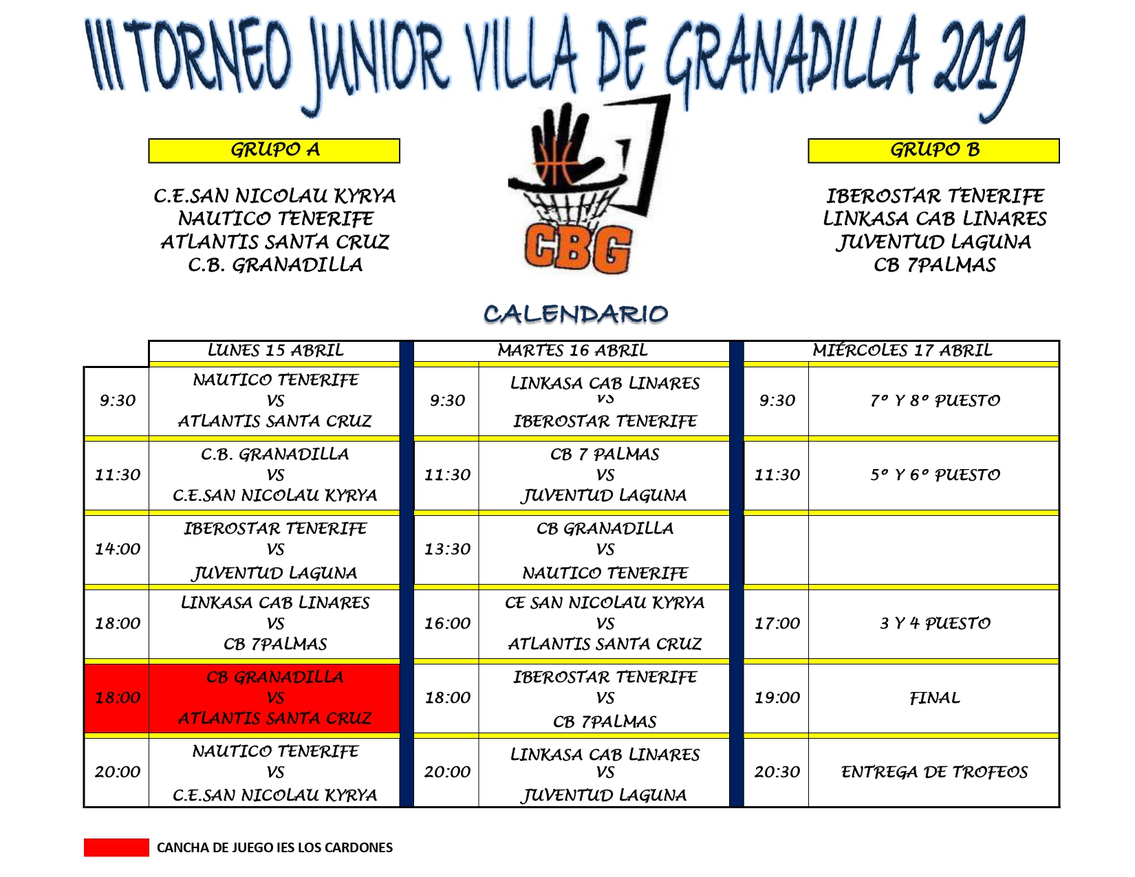 Participan en este torneo ocho equipos de diferentes puntos de la geografía española y va a tener lugar entre los días 15 y 17 de abril. Nuestro equipo se ha desplazado en la mañana de hoy a tierras canarias y debuta a las 18:00 h ante CB 7 Palmas. El martes día 16 jugará a primera hora de la mañana ante Iberostar Tenerife y cerrará la jornada a partir de las 20:00 h ante Juventud Laguna. El miércoles, en función de la clasificación obtenida en la fase de grupos jugará por definir la posición definitiva en este gran torneo de categoría junior.