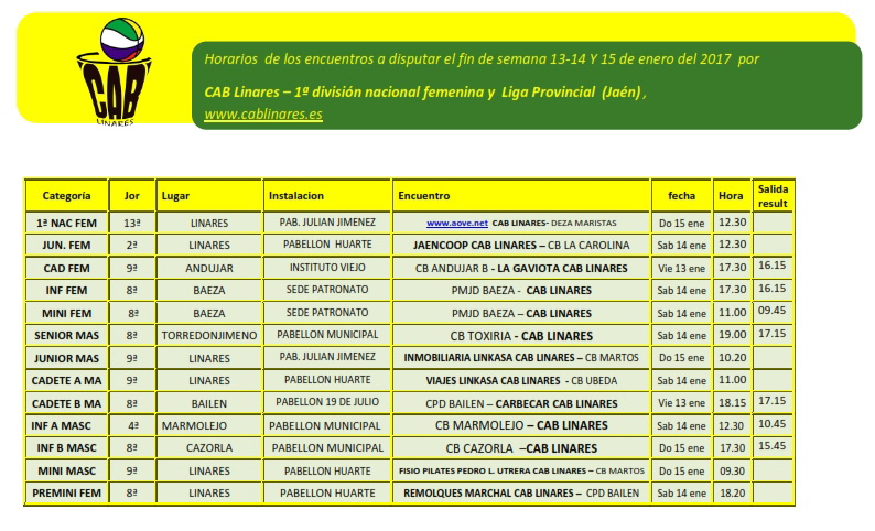 El sábado por la mañana el equipo mini femenino viaja a Baeza a la misma hora a la que el cadete masculino A, Viajes Linkasa CAB Linares, se enfrenta en casa a CD Úbeda Viva. El infantil masculino A viaja a Marmolejo para jugar el encuentro aplazado en la cuarta jornada y el junior femenino JaenCOOP CAB Linares disputa su partido en casa ante las chicas de La Carolina.