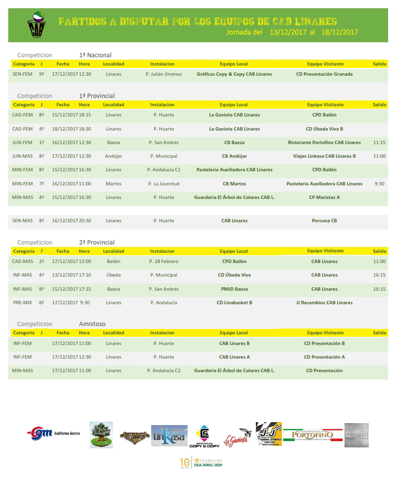 El mini femenino, Pastelería Auxiliadora CAB Linares disputa su segundo partido del fin de semana desplazándose a Martos para disputar el encuentro aplazado la semana pasada en un partido interesante de cara a mantenerse en la parte alta de la clasificación. El junior femenino Ristorante Portofino CAB Linares viaja a Baeza para disputar el encuentro correspondiente a la primera jornada aplazado en su día.