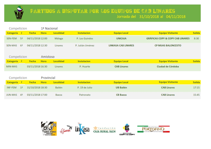 También el domingo, a partir de las 12:30, en el Pabellón Julián Jiménez, el equipo de 1ª Nacional Masculina, Linkasa CAB Linares afronta la sexta jornada de liga ante CP Mijas, partido en el que buscará la victoria para salir de la zona de nadie donde se encuentra ahora mismo en la clasificación.