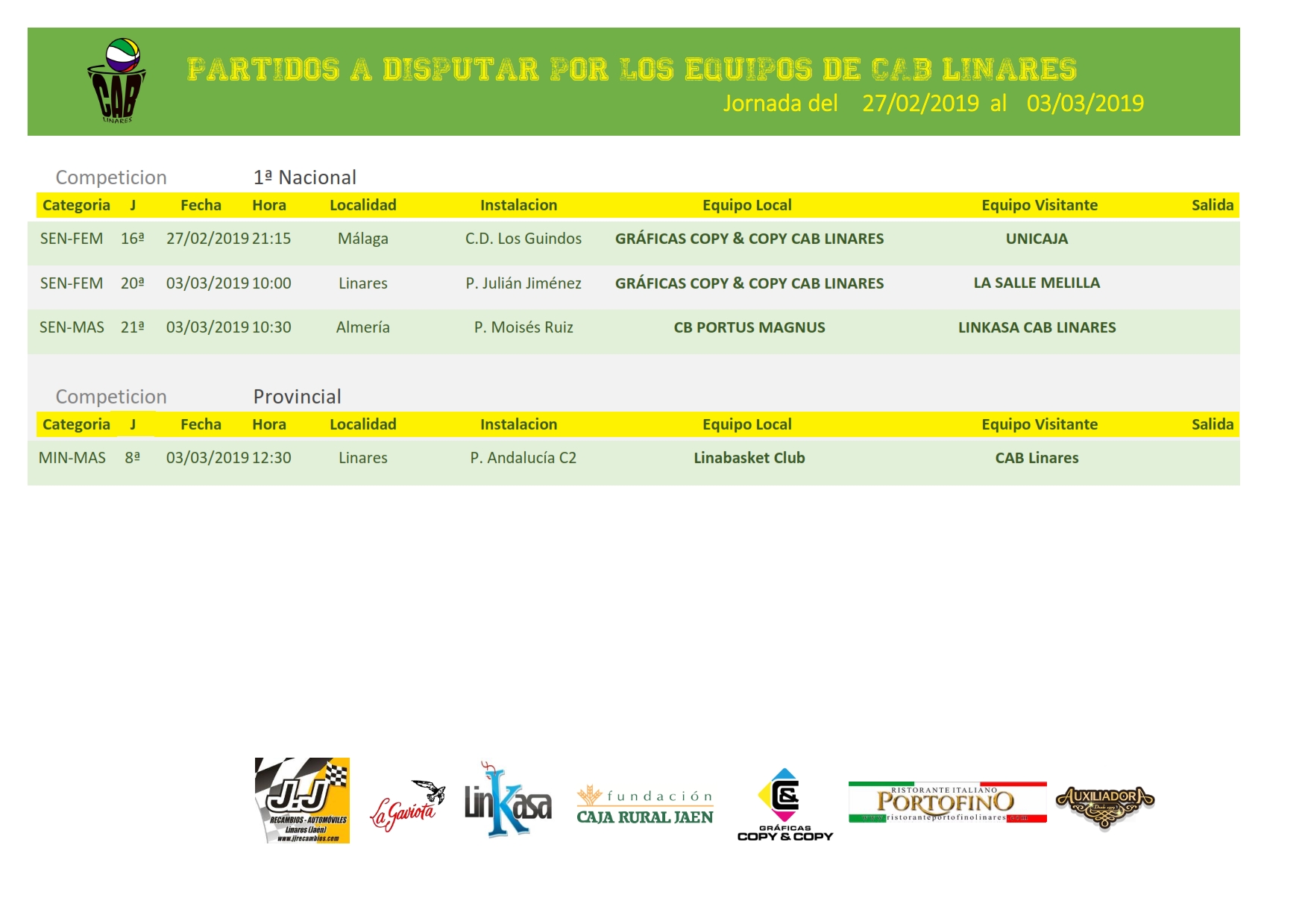 El domingo a partir de las 12:30 el mini masculino juega como visitante ante Linabasket el partido correspondiente a esta jornada. También el domingo, pero en horario diferente al habitual, nuestro equipo de Liga Nacional 1 Femenina Gráficas Copy & Copy CAB Linares recibe a La Salle Melilla en el Julián Jiménez a partir de las 10:00 h. El equipo masculino de Liga Nacional 1, Linkasa CAB Linares viaja a tierras almerienses a disputar su encuentro de la jornada ante CD Portus Magnus. Ambos equipos necesitan una victoria para poder engancharse a los puestos que dan opción a disputar el play off por el título una vez finalizada la liga regular.