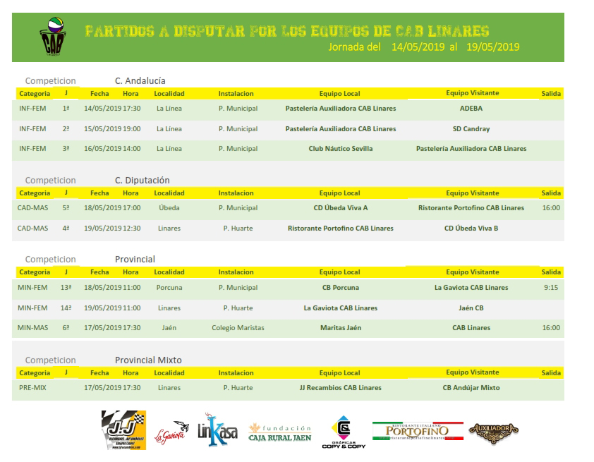 El sábado por la mañana el equipo minibasket femenino La Gaviota CAB Linares viaja a Porcuna a disputar el encuentro que se aplazó la jornada anterior. También el sábado por la mañana el cadete masculino Ristorante Portofino CAB Linares que está disputando la Copa Diputación viaja a Úbeda a enfrentarse con el equipo A de CD Úbeda Viva.