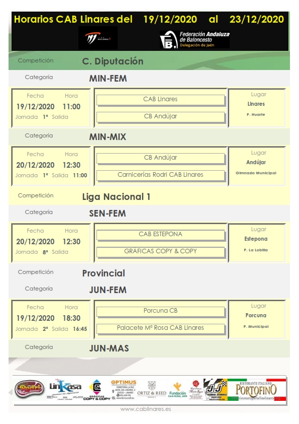 El domingo por la mañana el senior masculino provincial Valencianos CAB Linares disputa en Jaén la quinta jornada de competición con el que parece que va a ser uno de los gallitos de la competición. El mini mixto Carnicerías Rodri CAB Linares viaja a Andújar para estrenarse en competición de Copa Diputación. El equipo de Liga Nacional 1 Femenina Gráficas Copy & Copy CAB Linares se despide de la competición en este año 2020 disputando la octava jornada de competición en Estepona.