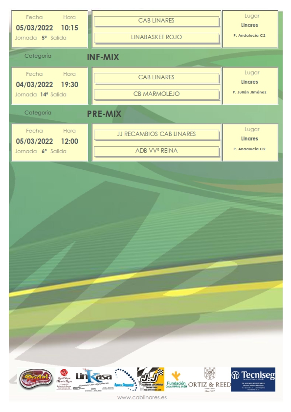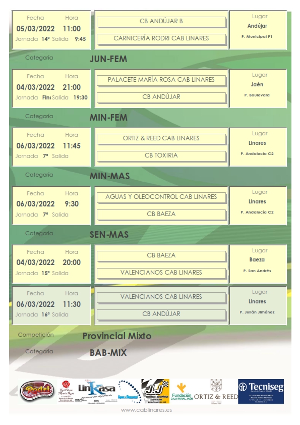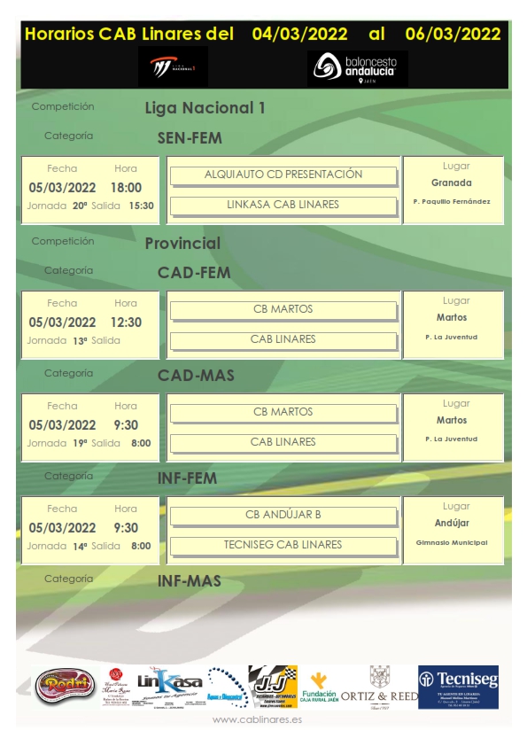 El sábado por la mañana viene cargado de encuentros para los equipos de nuestro club. Madrugan los chicos del cadete masculino y las chicas del infantil femenino, Tecniseg CAB Linares, que jugarán sus respectivos encuentros a primera hora de la mañana en Martos y Andújar. Nuestros equipos de las ligas Valorcesto, el baby mixto y el premini mixto, JJ Recambios CAB Linares, jugarán en el Andalucía sus partidos ante Linabasket y ADB Villanueva de la Reina respectivamente. El infantil masculino, Carnicería Rodri CAB Linares, viaja a Andújar a enfrentarse con el equipo B iliturgitano. Y cierra la jornada matinal el cadete femenino que disputa en Martos su encuentro de la jornada.