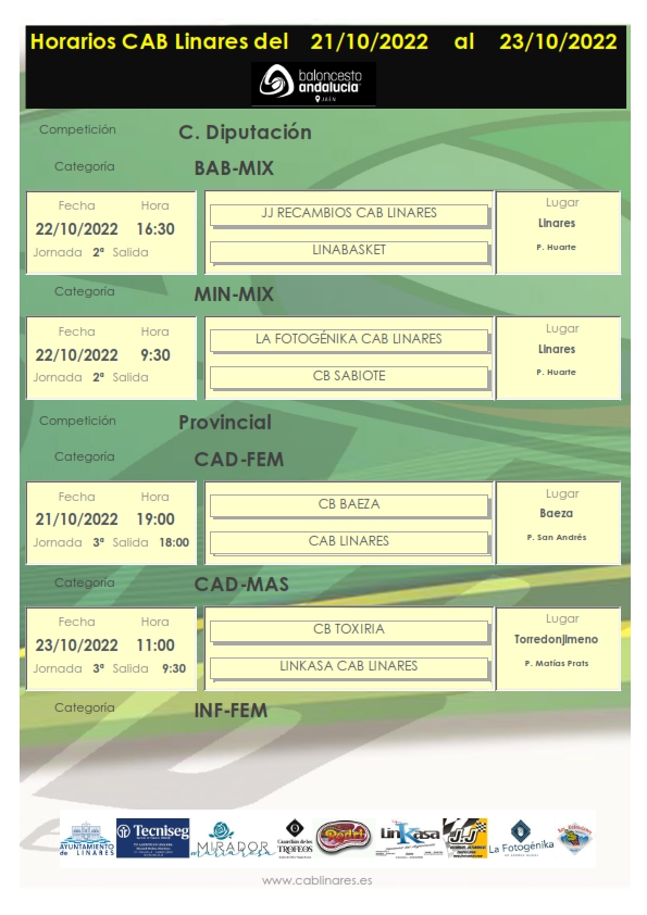 El sábado por la mañana el mini mixto La Fotogénika CAB Linares recibe a primera hora en el Huarte a CB Sabiote. Ya en la jornada de tarde, el baby mixto JJ Recambios CAB Linares disputa derbi local con Linabasket en su debut en la competición esta temporada.