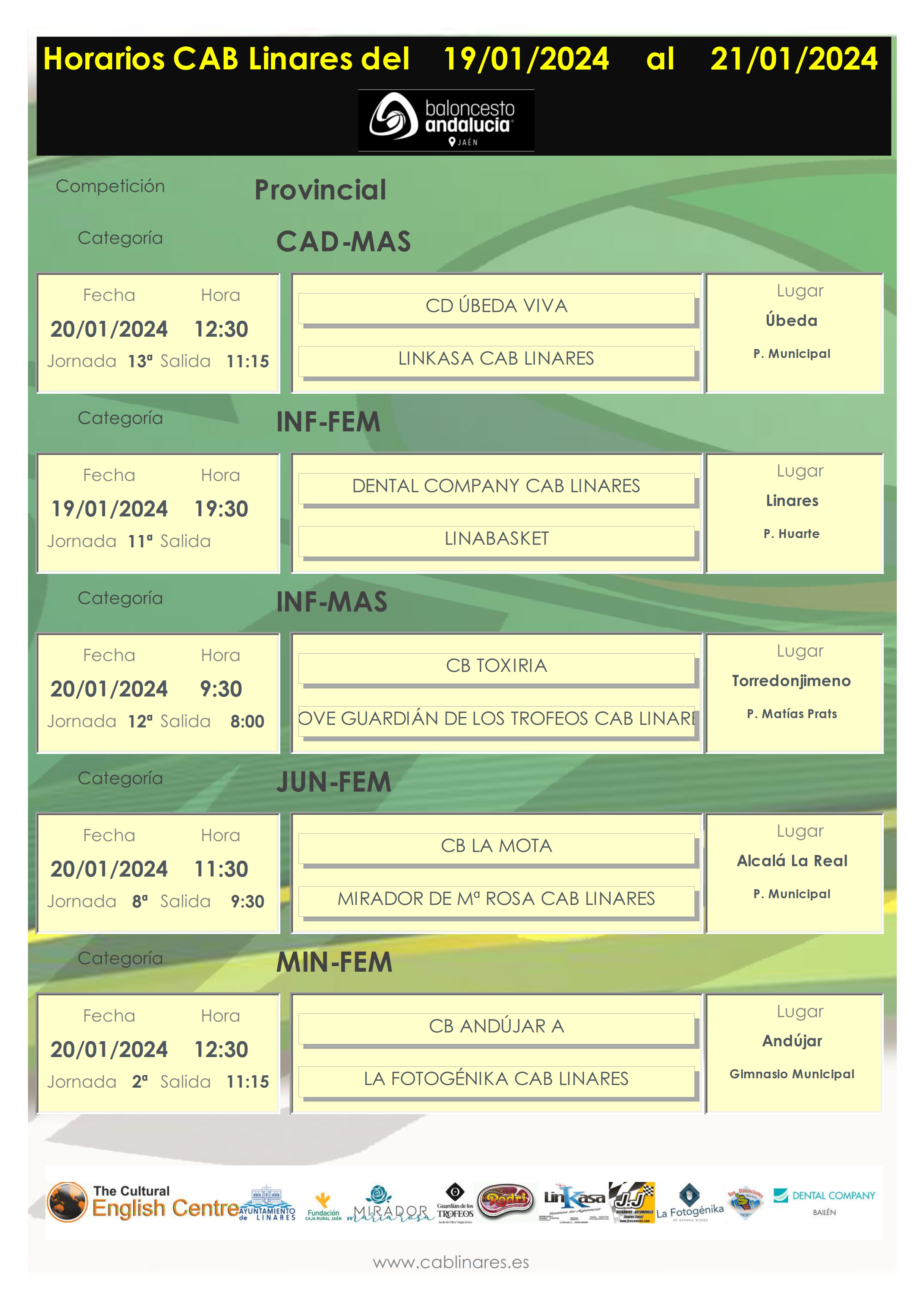 El sábado por la mañana madrugan los infantiles de AOVE Guardián de los Trofeos CAB Linares para viajar a Torredonjimeno a disputar su encuentro de la jornada. El premini femenino Indiana Games CAB Linares juega en el Huarte ante Jaén CB. El junior femenino Mirador de María Rosa CAB Linares visita la cancha de CB La Mota. El premini masculino Carnicería Rodri CAB Linares recibe en el segundo turno en el Huarte a Jaén CB. El cadete masculino Linkasa CAB Linares visita la pista de CD Úbeda Viva y el mini femenino La Fotogénika CAB Linares debuta en competición provincial en la cancha de CB Andújar.
