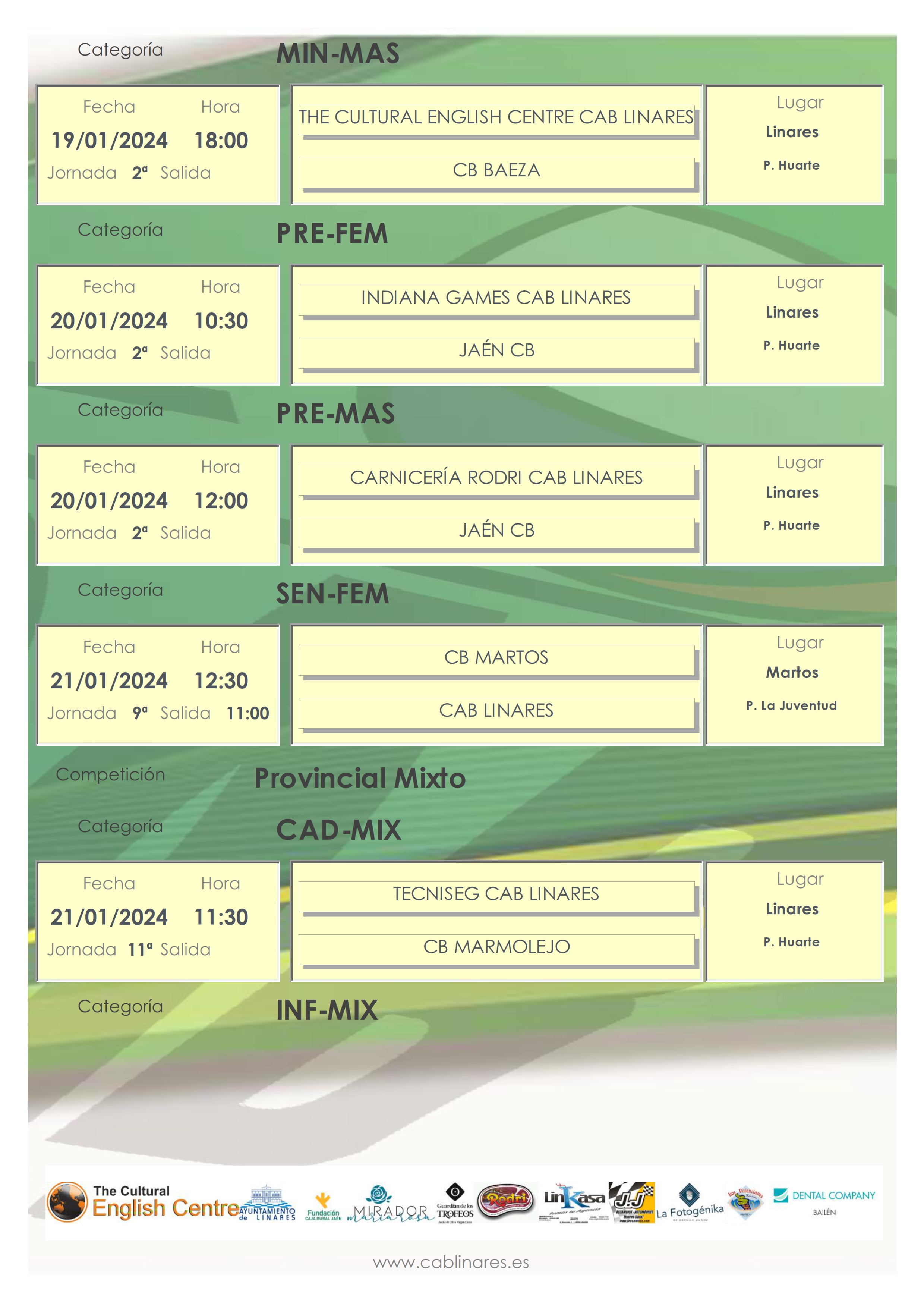 El domingo abre jornada en el Huarte el infantil mixto que recibe la visita de CB Marmolejo. El cadete mixto Tecniseg CAB Linares, en el segundo turno de juego tiene como rival también al conjunto de Marmolejo. Cierra la jornada el senior femenino que viaja a Martos.
