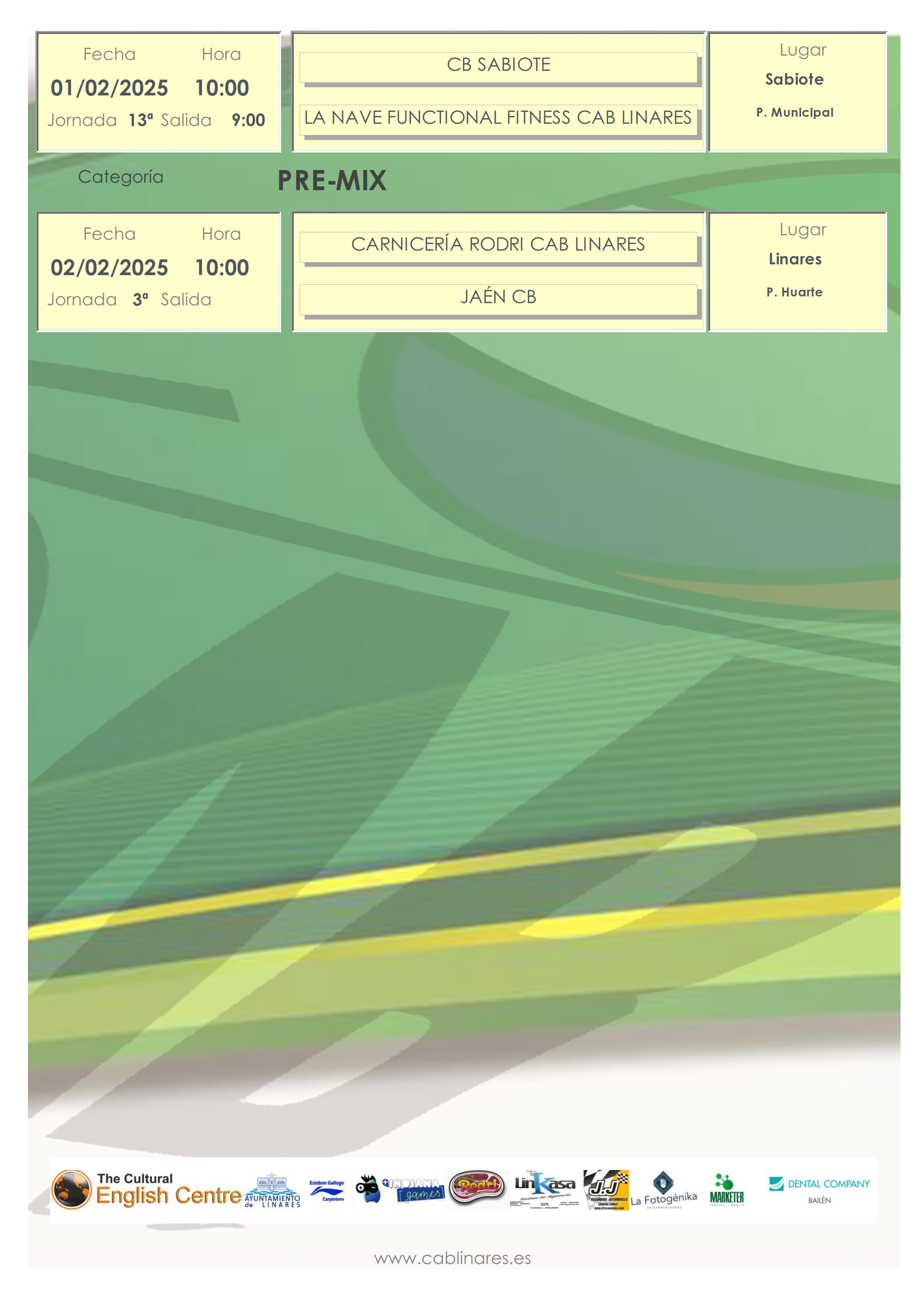 En la mañana del domingo el premini mixto Carnicería Rodri CAB Linares recibe en el Huarte a Jaén CB. A continuación el mini femenino La Fotogénika CAB Linares disputa su partido ante CB Martos. En Jaén, el junior femenino, Tecniseg CAB Linares, disputa la última jornada de liga regular ante Jaén CB en busca de la segunda plaza de cara a la fase final que comenzará a disputarse a mediados de febrero.