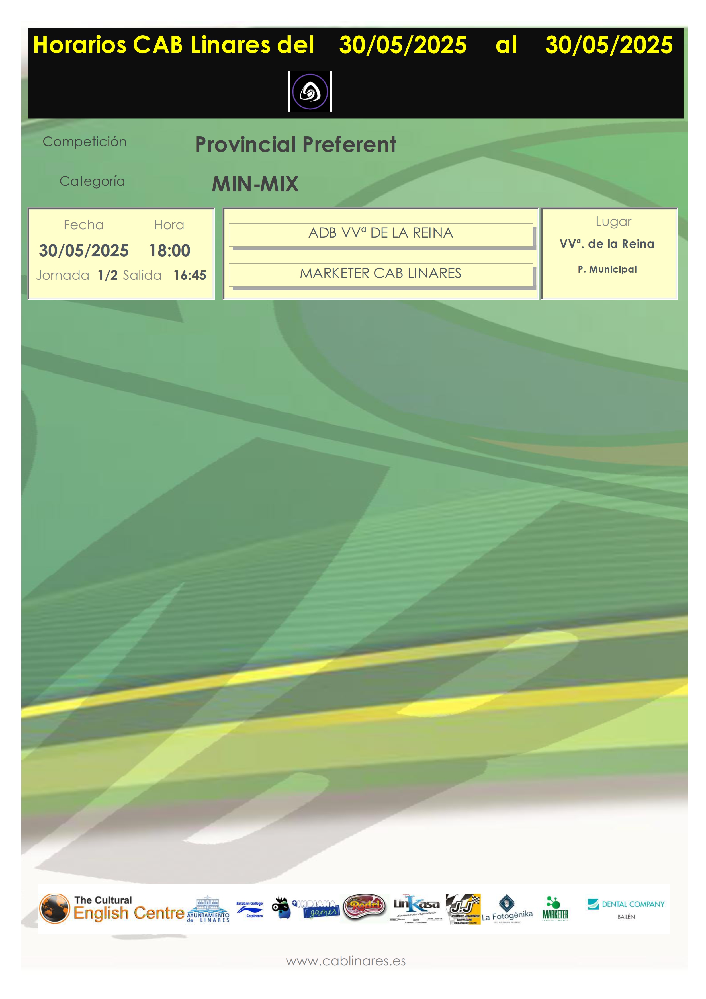 En esta última jornada tan solo compite ya nuestro mini mixto, Marketer CAB Linares, que disputa en Villanueva de la Reina la final a cuatro de la Liga Preferente de la categoría. Su rival en la semifinal será el anfitrión, y campeón de la liga regular, ADB Villanueva de la Reina. En caso de victoria de los chicos de Jaime García, se enfrentarían al vencedor de la otra semifinal, que disputan los conjuntos de CB Baeza y CD Úbeda Viva.