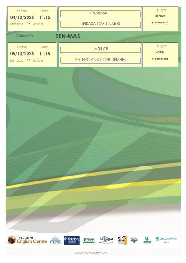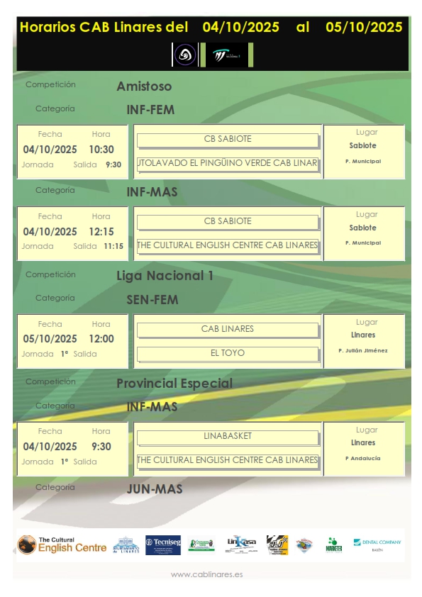 El infantil masculino, The Cultural English Centre CAB Linares, debuta en liga provincial como visitante ante Linabasket. A continuación, en el Andalucía, el junior masculino, Linkasa CAB Linares, se mide a idéntico rival en la primera jornada liguera.