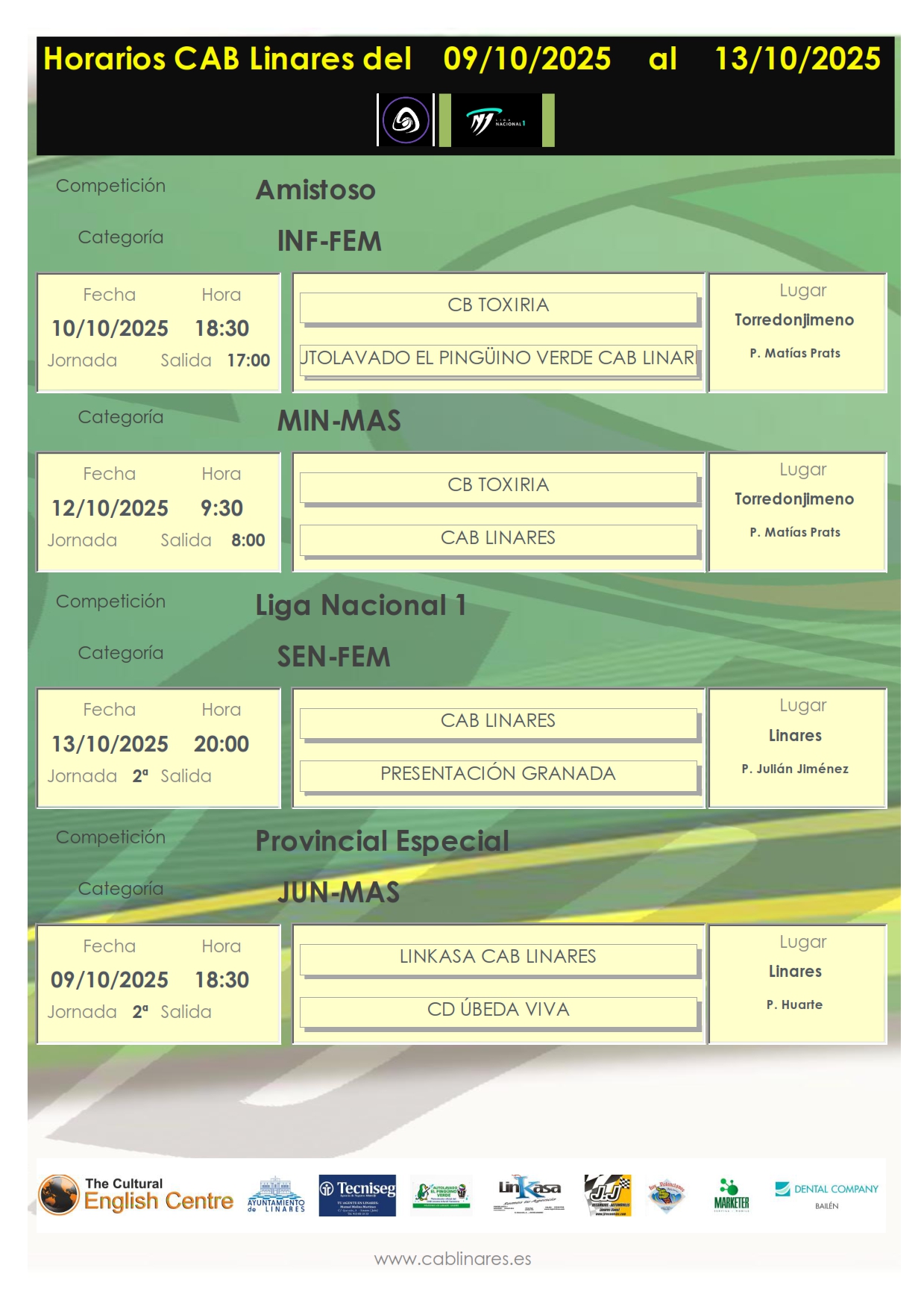 En la tarde del jueves el junior masculino, Linkasa CAB Linares, recibe en el Huarte a CD Úbeda Viva. El viernes por la tarde el infantil femenino, Autolavado El Pingüino Verde CAB Linares, se desplaza a Torredonjimeno a disputar un encuentro de carácter amistoso. Mismo desplazamiento el domingo para el mini masculino, también para jugar un partido preparatorio con el conjunto toxiriano.