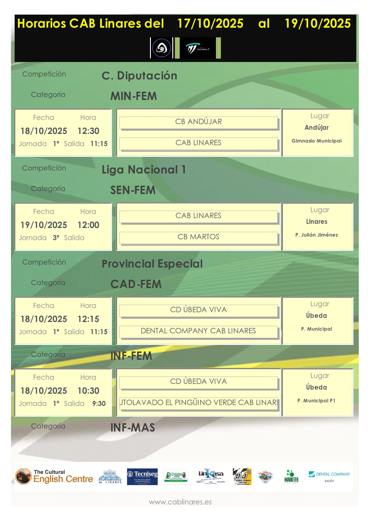 En la mañana del sábado el infantil femenino, Autolavado El Pingüino Verde CAB Linares viaja a Úbeda para debutar en competición. A continuación el cadete femenino, Dental Company CAB Linares, disputará también su partido de debut en competición. El infantil masculino, The Cultural English Centre CAB Linares recibe en el Huarte a CB Toxiria. El mini femenino viaja a Andújar para comenzar su participación en Copa Diputación.