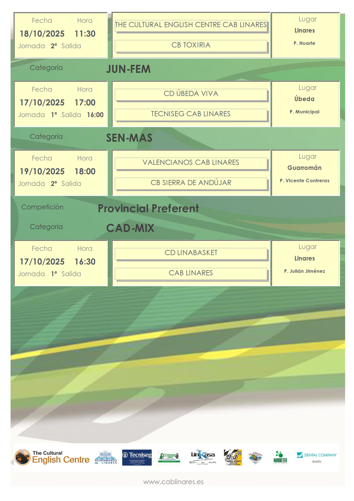 El viernes por la tarde el cadete mixto se mide a Linabasket en el Julián Jiménez. El junior femenino, Tecniseg CAB Linares debuta en competición ante CD Úbeda Viva en tierras ubetenses.
