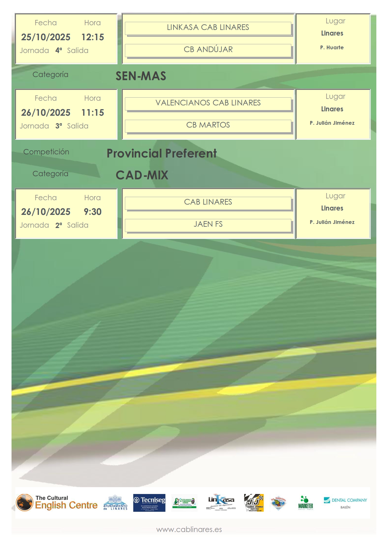 Nueva jornada de competición en Liga Provincial, Copa Diputación y Liga Nacional 1 Femenina para los equipos de CAB Linares, que comienza en la mañana del sábado con el partido de nuestro mini mixto Indiana Games CAB Linares, que se desplaza a Sabiote para disputar su segunda jornada liguera. En Baeza en infantil masculino, The Cultural English Centre CAB Linares disputa su partido de la jornada. El junior masculino, Linkasa CAB Linares, recibe en el Huarte a CB Andújar y el premini femenino, Carnicería Rodri CAB Linares debuta en Copa Diputación en el Andalucía ante Linabasket.