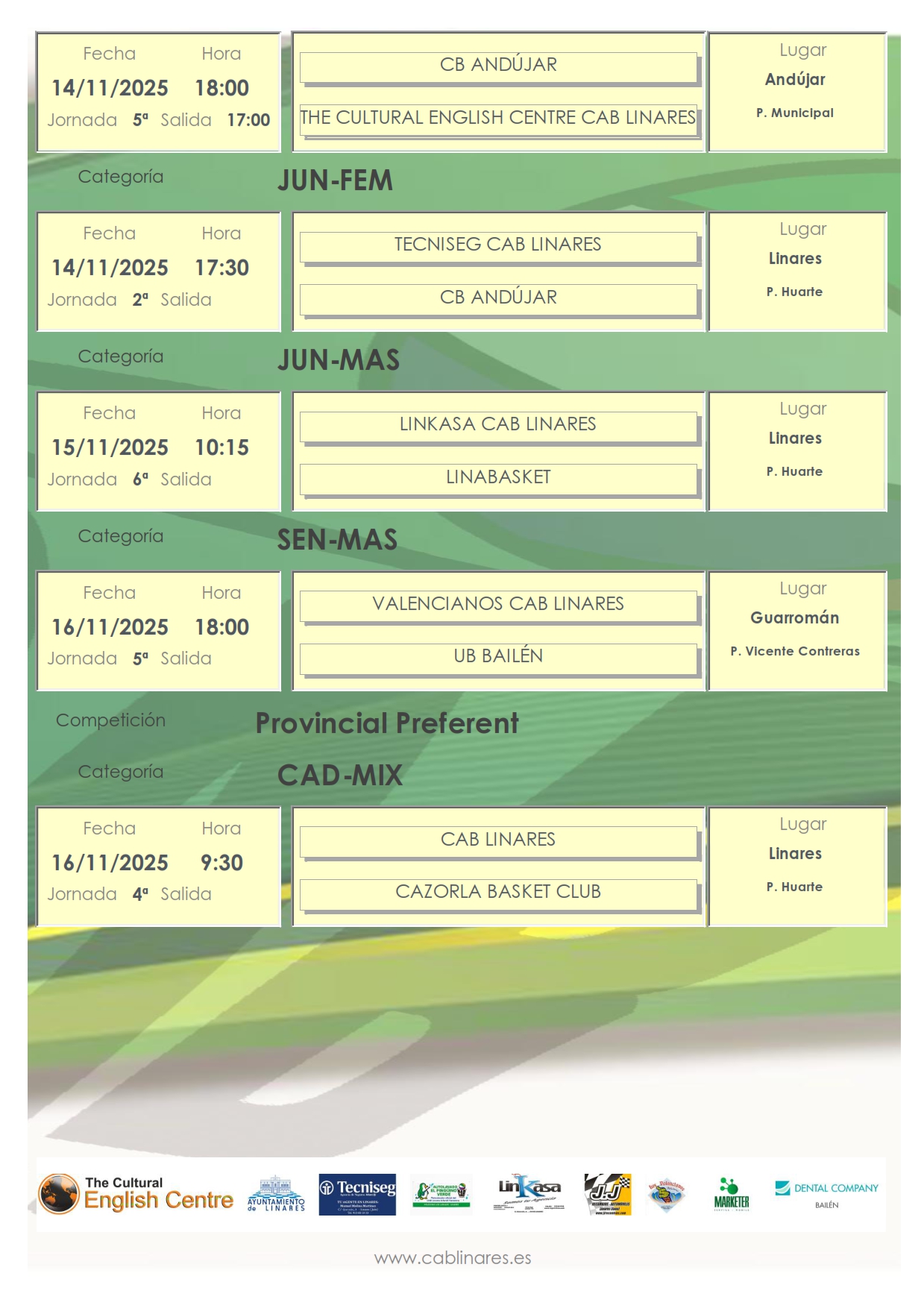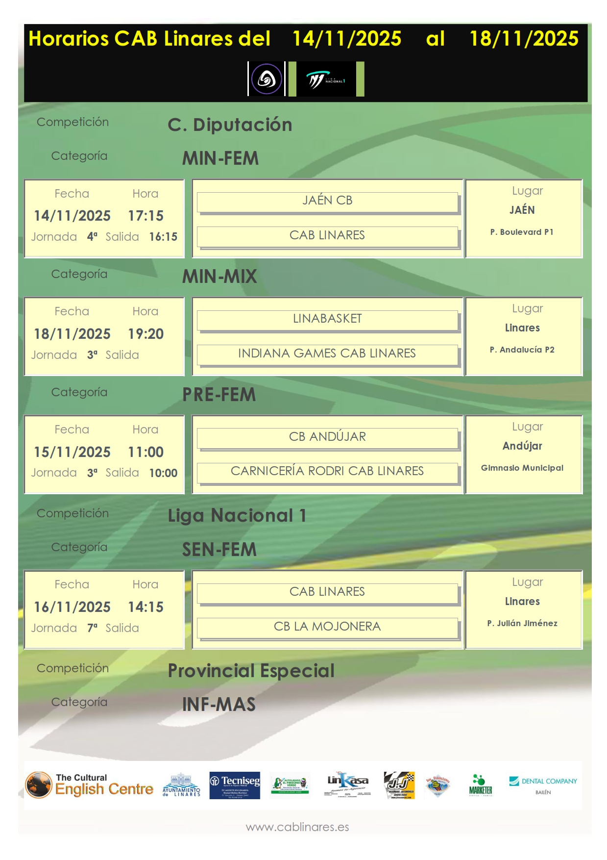 Nueva jornada de competición para los equipos de CAB Linares que comienza en la tarde del viernes en la que el mini femenino viaja a Andújar para disputar su partido de Copa Diputación. El junior femenino, Tecniseg CAB Linares, recupera el partido correspondiente a la segunda jornada de competición aplazado en su día con CB Andújar en el Huarte. El infantil masculino, The Cultural English Centre CAB Linares viaja a Andújar para disputar la quinta jornada de competición provincial.