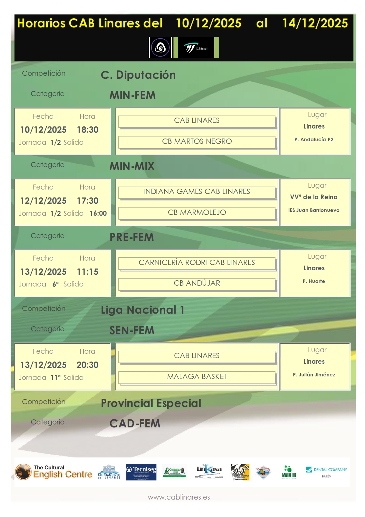En la mañana del sábado, el junior masculino, Linkasa CAB Linares visita la cancha de CB Andújar. El premini femenino, Carnicería Rodri CAB Linares, disputa su partido de Copa Diputación en el Huarte ante CB Andújar.