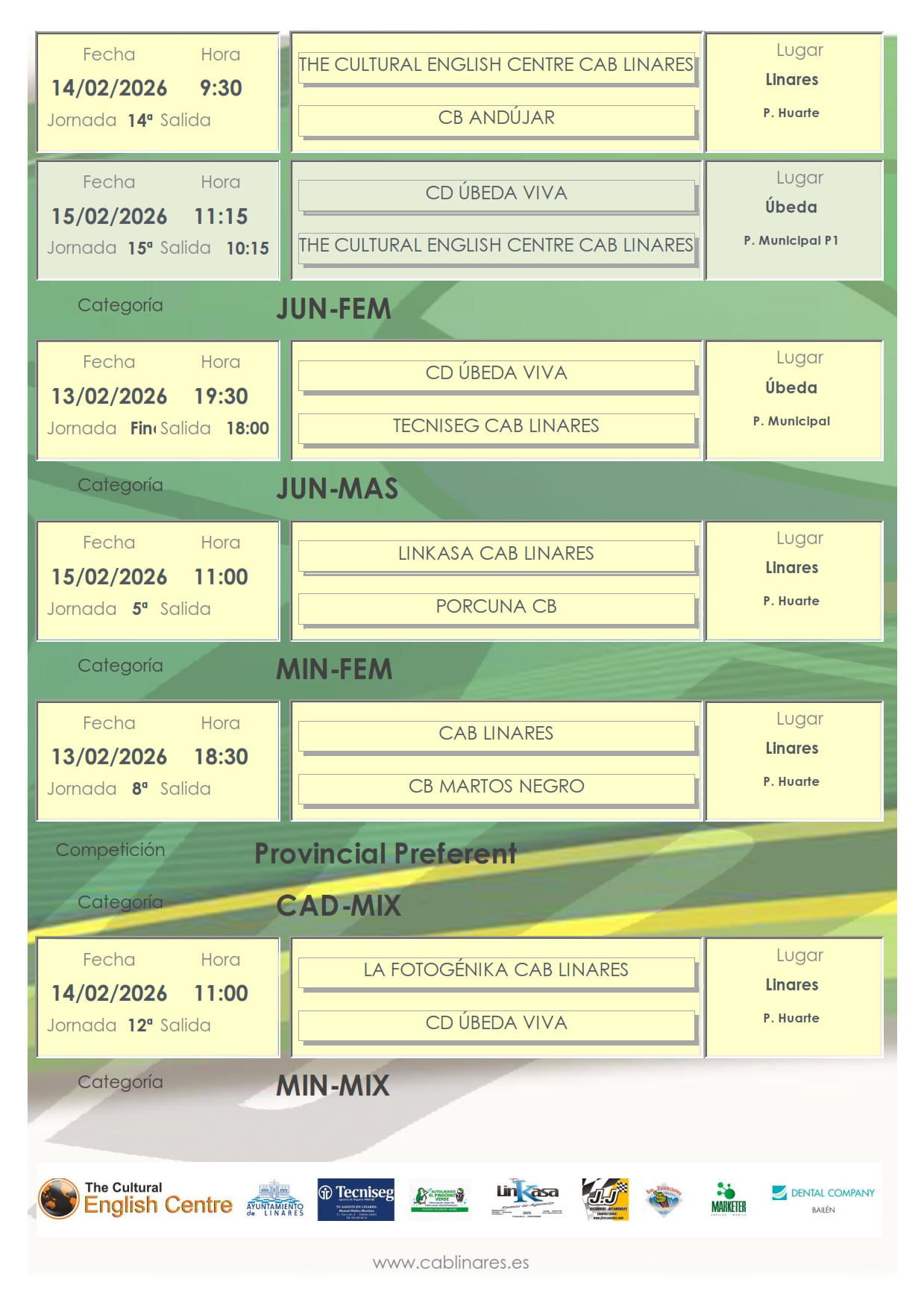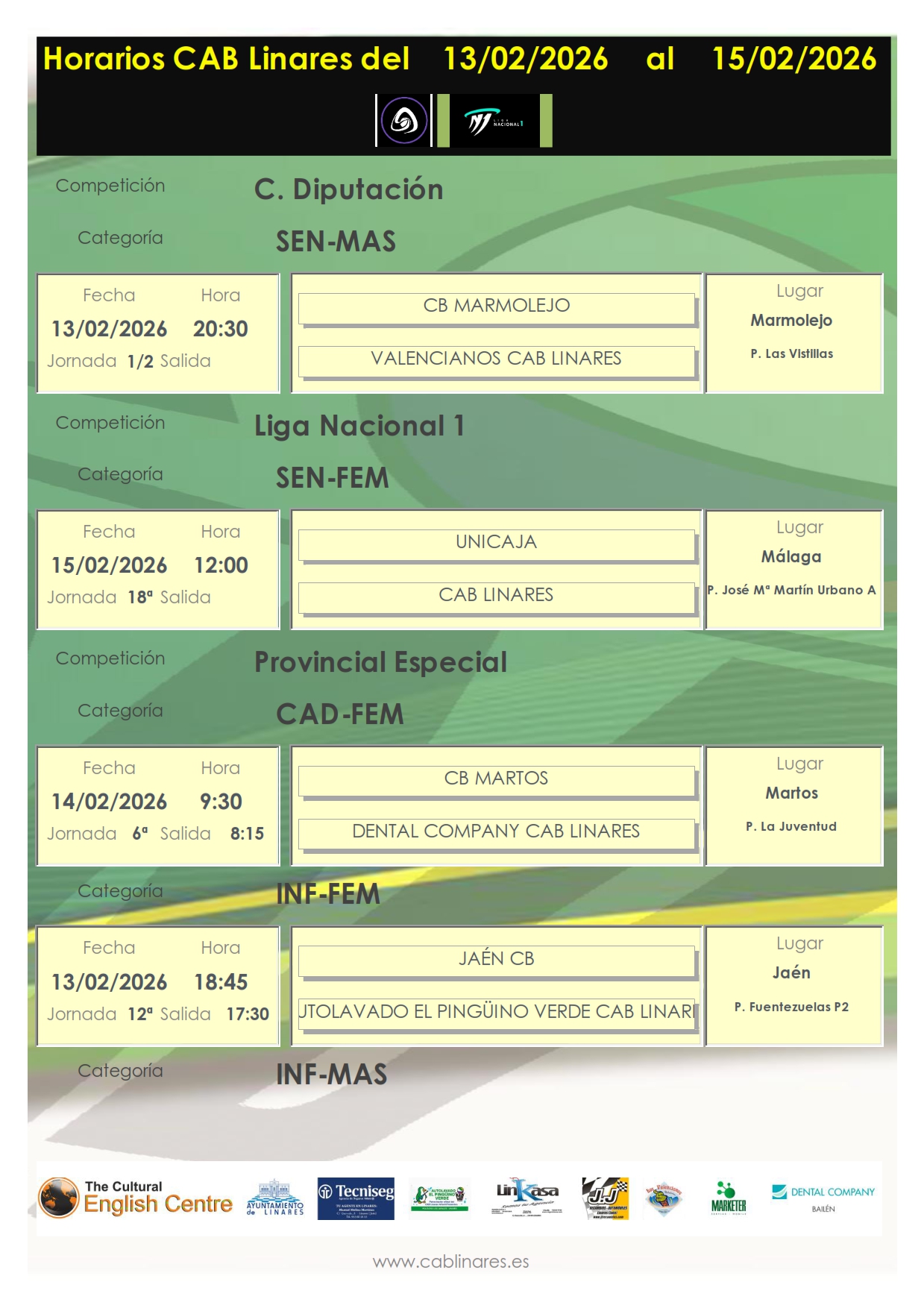 La mañana del domingo nos deja el partido junior masculino que enfrenta a nuestro equipo Linkasa CAB Linares con Porcuna CB. El infantil masculino The Cultural English CAB Linares visita a CD Úbeda Viva y cierra la jornada el equipo de Liga Nacional 1 Femenina que viaja a Málaga para medirse con Unicaja.