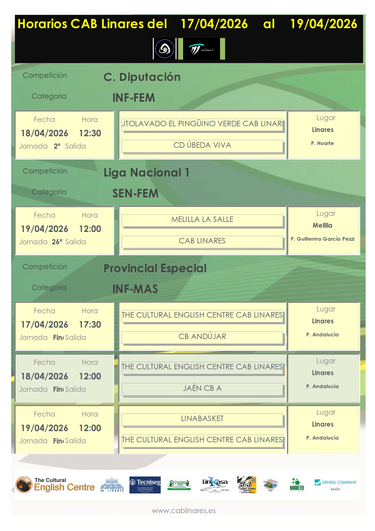 La próxima jornada de competición nos trae la disputa de la Fase Final Provincial Infantil Masculina, en la que a partir del viernes por la tarde, nuestro equipo The Cultural English Centre CAB Linares buscará el título provincial amén de la clasificación para el Campeonato de Andalucía de la categoría. En la tarde del viernes, en el primer turno de encuentros se medirá con CB Andújar. En el segundo turno matinal del sábado el rival será Jaén CB y concluirá el domingo por la mañana ante el anfitrión Linabasket, ya clasificado para el CADEBA al haber sido campeón de la liga regular. Los partidos se disputarán en el Pabellón Andalucía y animamos a nuestros socios, deportistas y simpatizantes a que acudan a animar y disfrutar de este evento provincial.