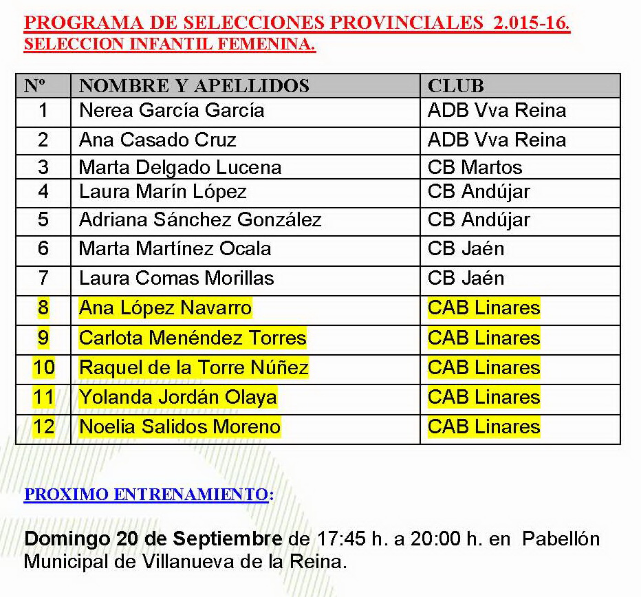 Una vez concluído el período de selección, queda conformada la selección provincial infantil femenina, que queda convocada al próximo entrenamiento a celebrar en la localidad de Villanueva de la Reina el próximo domingo dia 20 de septiembre a las 17:45 h.