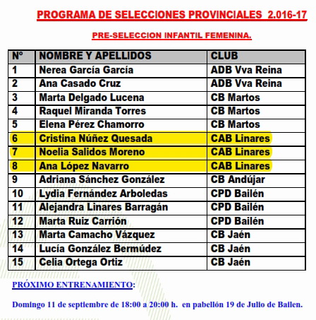 Nueva convocatoria de entrenamiento de la selección provincial infantil femenino para el próximo domingo día 11 de septiembre en las instalaciones deportivas del Pabellón 19 de Julio de Bailén de 18:00 a 20:00 h.