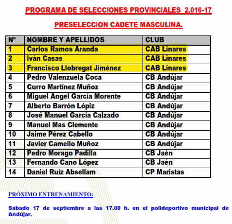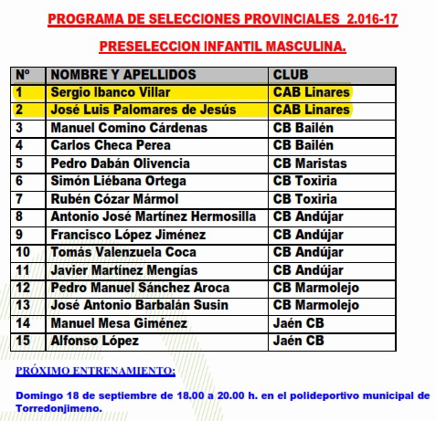 Programa de Selecciones ProvincialesCAD-MAS 17/09 ANDÚJARCAD-FEM 18/09 MARMOLEJOINF-MAS 18/09 TORREDONJIMENOINF-FEM 17/09 LINARESINF-FEM 18/09 MARMOLEJO |