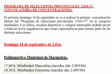 Nuevo fin de semana con concentraciones de las diferentes selecciones provinciales a las que en esta ocasión se añaden las de categoría minibasket, que celebran concentraciones abiertas tanto en masculino como en femenino el domingo por la tarde en Marmolejo.