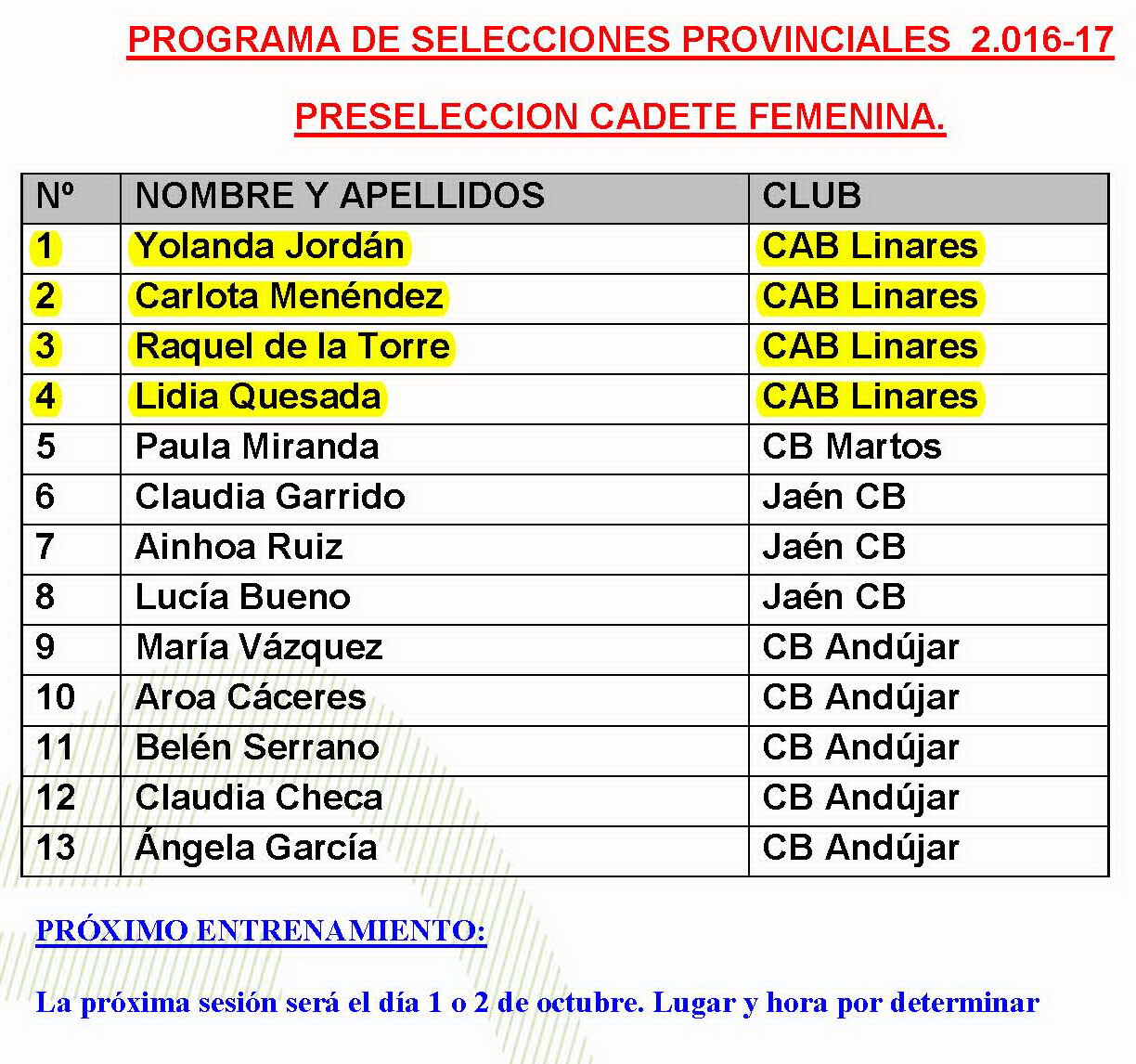- INFANTIL FEMENINO Domingo 25/09/16 a las 09:15 en Linares (Pabellón Andalucía) y a las 16:00 Pabellón IES Juan Barrionuevo de Villanueva de la Reina.