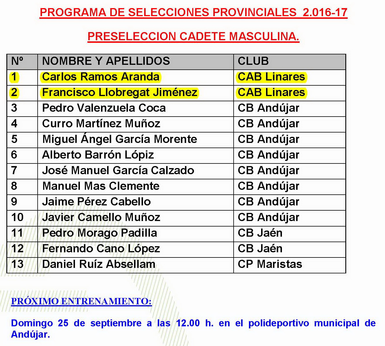 Tras las concentraciones del pasado fin de semana, poco a poco se van perfilando las selecciones provinciales que representarán a la Delegación Provincial en los Campeonatos de Selecciones Autonómicas. En el caso de la infantil femenina afrontan su segunda convocatoria con el equipo cerrado y en las demás, salvo en mini, que aún realizan convocatorias abiertas en masculino y en femenino, las listas de convocados/as son ya muy reducidas. Desde CAB Linares les deseamos a los deportistas de nuestro club que aspiran a mantenerse en ellas mucha suerte.