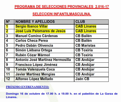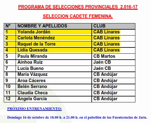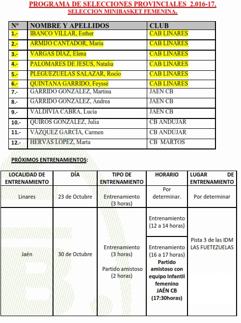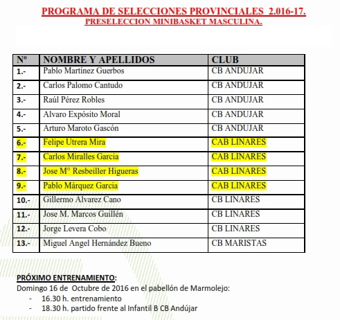 Programa de Selecciones ProvincialesCAD-MAS 16/10 LINARESCAD-FEM 16/10 JAÉNINF-MAS 16/10 LINARESMINI-MAS 16/10 MARMOLEJOMINI-FEM 23/10 LINARES |