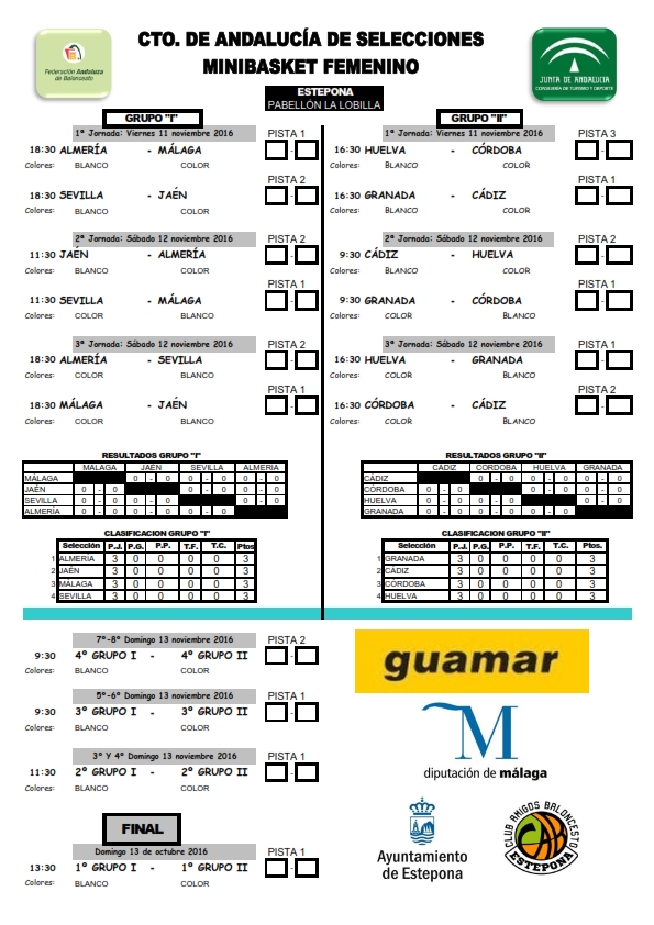Las chicas han sido emparejadas en el grupo I con las selecciones de Almería, Málaga y Sevilla. Debutarán el viernes ante el equipo sevillano para después enfrentarse el sábado en turno de mañana a Almería y por la tarde con Málaga. El domingo disputarán, en función de la clasificación obtenida en el grupo, el último partido del campeonato.