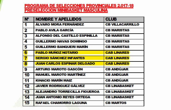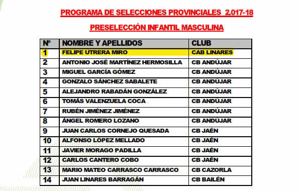 Selección CAD-MAS - Jaén 24/09/17Preselección CAD-FEM - Andújar 24/09/17Preselección INF-MAS - Andújar 24/09/17Preselección INF-FEM - Martos 24/09/17Preselección MIN-MAS - Marmolejo 24/09/17Preselección MIN-FEM - Jaén 24/09/17 |