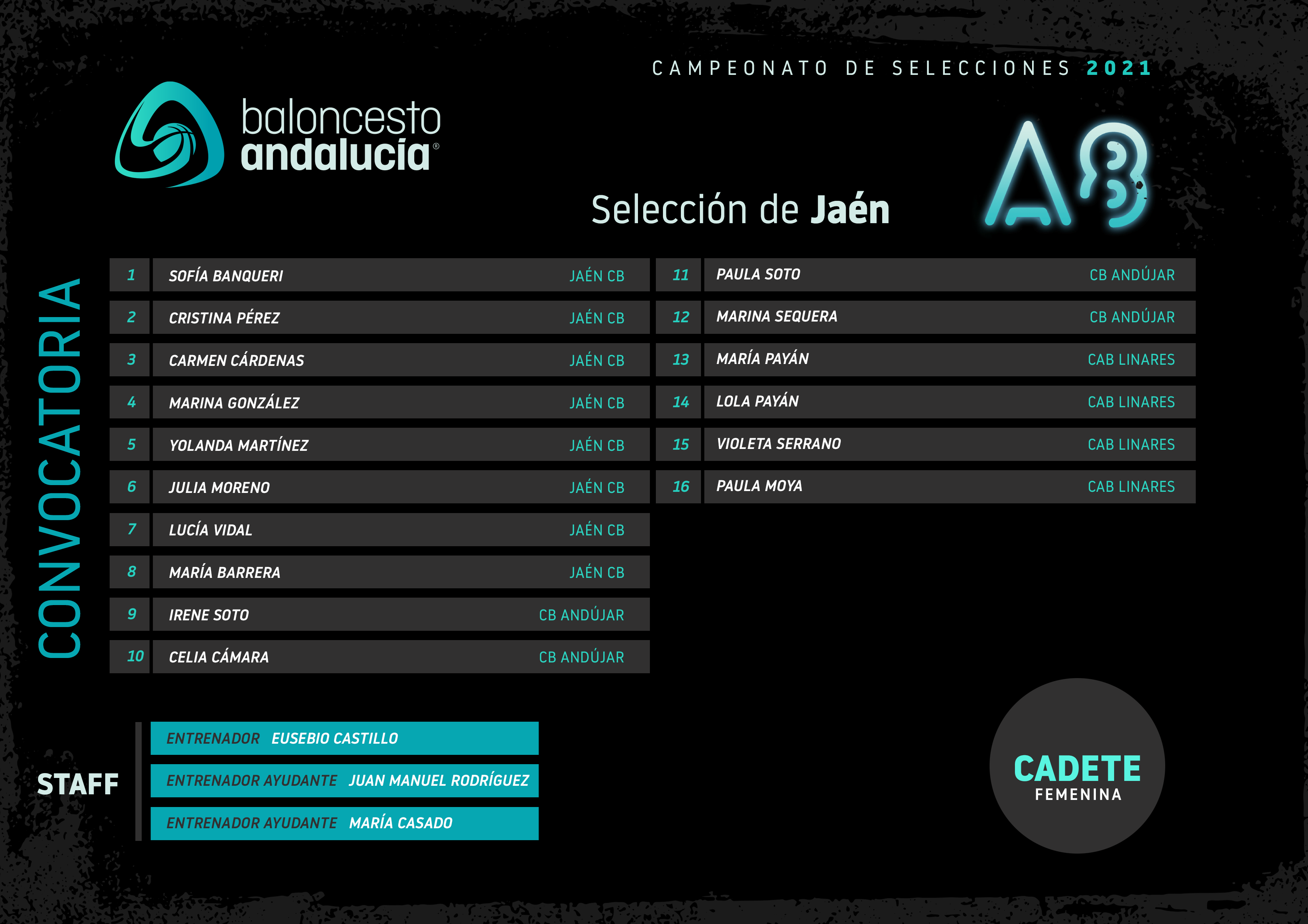 El departamento técnico de la Delegación Provincial de la FAB ha hecho pública la convocatoria de la primera concentración del programa de selecciones provinciales correspondiente a la categoría cadete femenina. El listado está compuesto por 16 deportistas entre las cuales se encuentran cuatro jugadoras de nuestro club: Lola Payán, María Payán, Paula Moya y Violeta Serrano, a las cuales les deseamos mucha suerte y que disfruten de la experiencia. También en el cuadro técnico CAB Linares está representado en la figura de Eusebio Castillo como técnico.