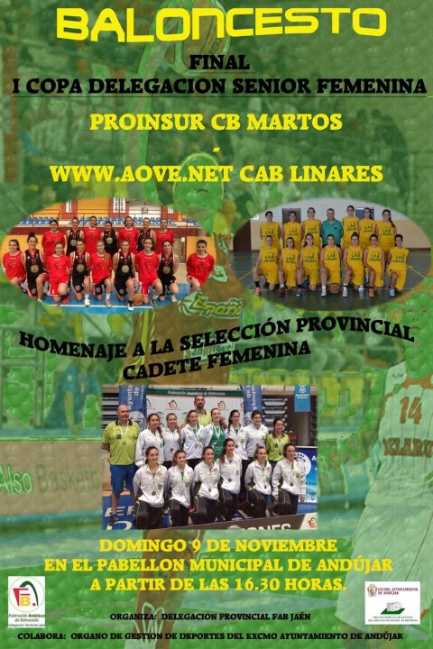 El domingo día 9 de noviembre se disputará el encuentro que decidirá quién es el campeón de la I Copa Delegación Femenina. El encuentro, que tendrá lugar en el Pabellón Municipal de Andújar a las 16:30 h, enfrentará a nuestro equipo senior femenino www.aove.net CAB Linares y al conjunto Proinsur CB Martos, y decidirá quién es el primer ganador de esta competición.