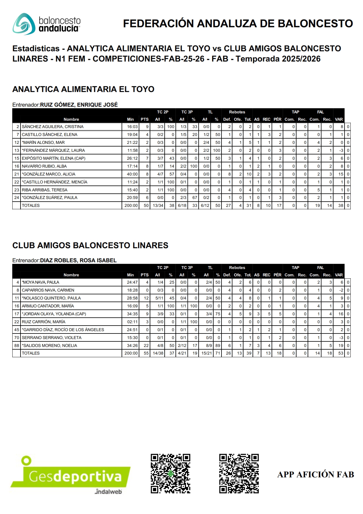 Por parte de CAB Linares destacó Noelia Salidos con 22 puntos y 19 de valoración y por parte local Alicia González, su última incorporación, con 15 de valoración, 8 puntos y 10 rebotes. Dirigieron el encuentro los Sres. Hernández y Tenorio que eliminaron por faltas a la local Teresa Riba.