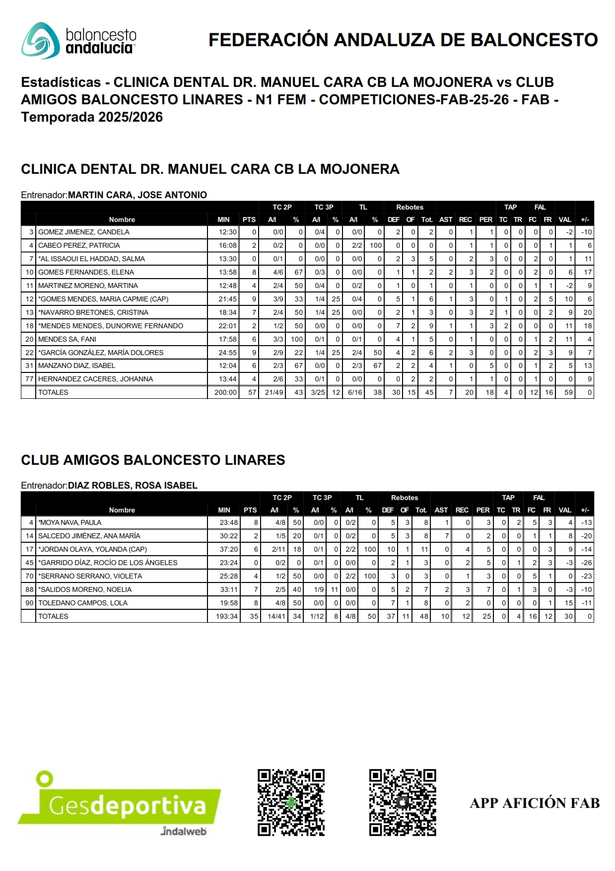 Destacaron por parte de las locales en el apartado anotador María Gomes y Mª Dolores García con 9 puntos y Lola Toledano por parte linarense con 8 puntos. Dirigieron el encuentro los Sres. Hernández y Castillo que eliminaron por faltas a Paula Moya y Violeta Serrano por parte linarense.