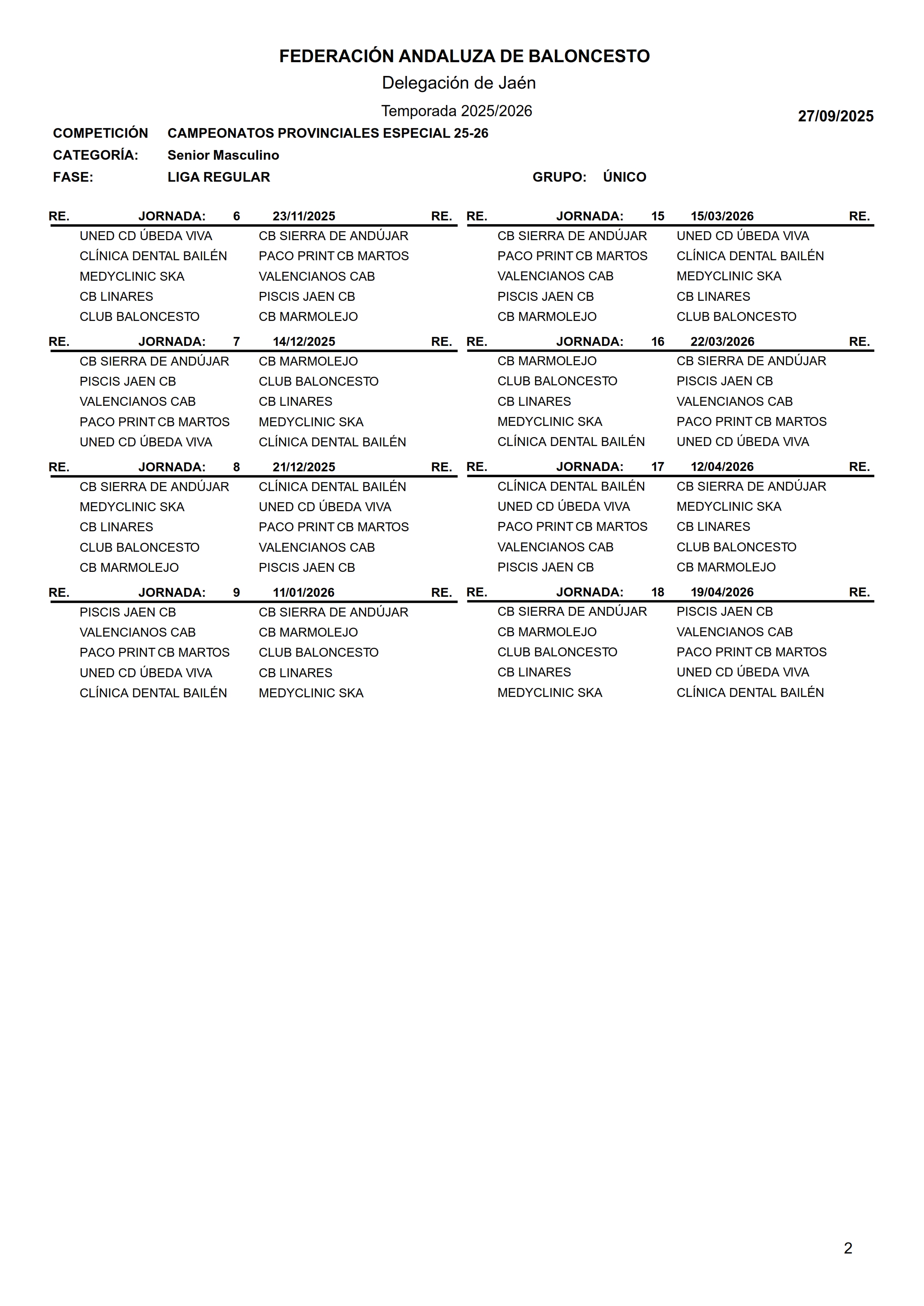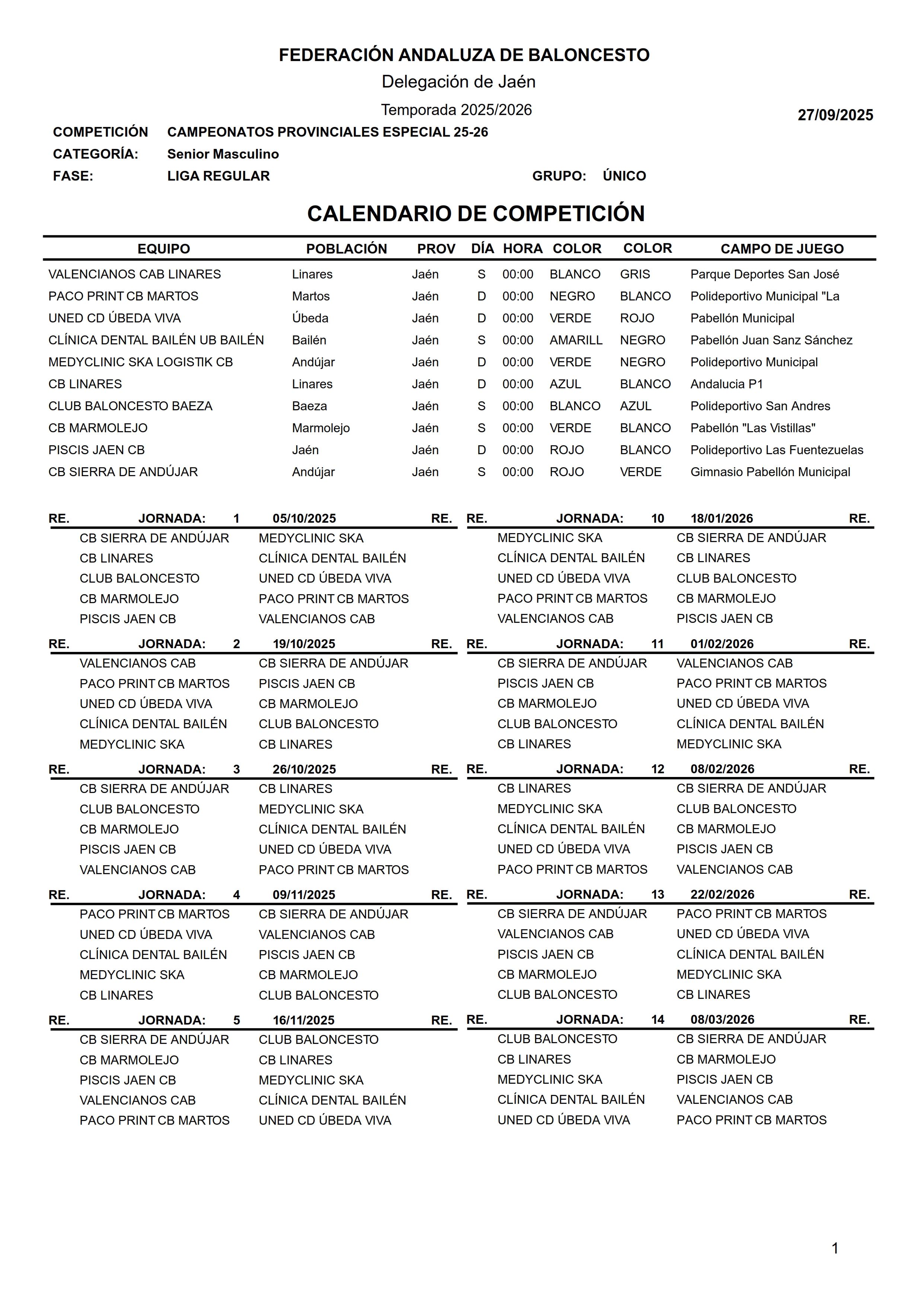 Calendario Liga Provincial Senior Masculino 2025/2026 webmaster Categoría: Calendarios 2025/2026 27 Septiembre 2025 Visitas: 237 Facebook X Anterior Siguiente